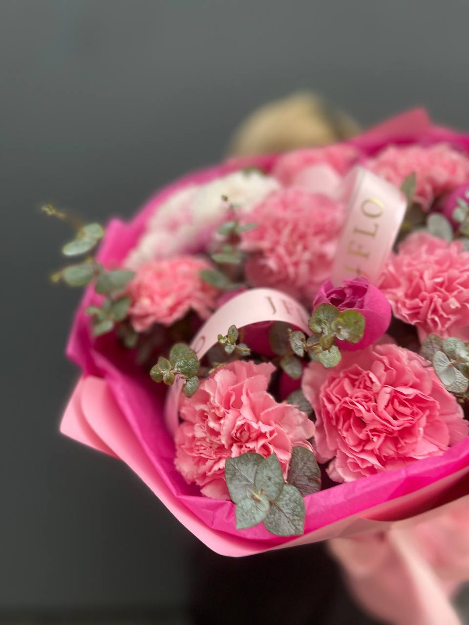 Тридцать один бутон Джумилии собран в плотную композицию с графичным силуэтом. Лепестки раскрываются слоями, создавая объёмную текстуру в цилиндре. Эвкалипт добавляет вертикальный ритм и завершает форму.
