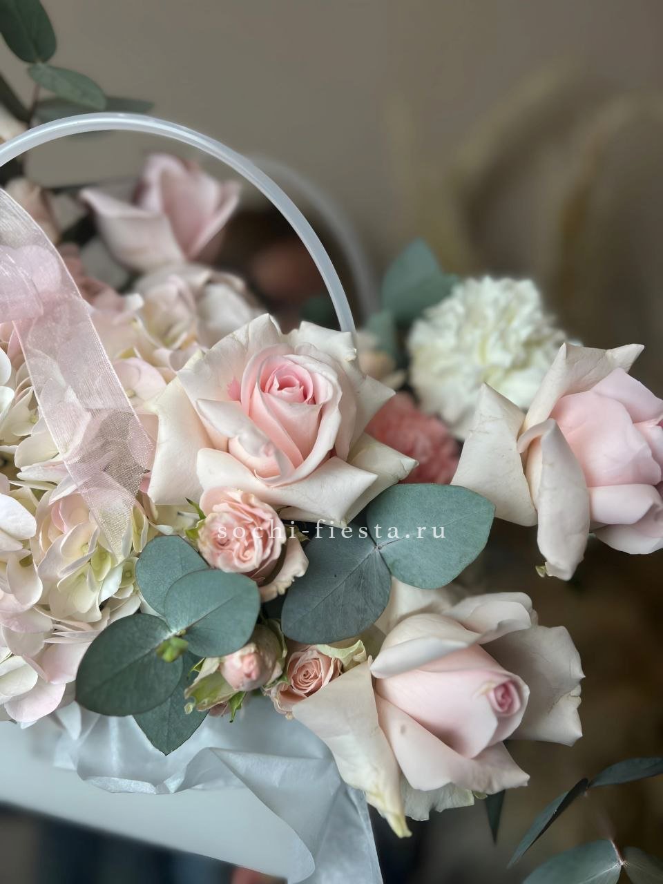 гортензия, розовые розы, пионовидные розы, диантус, эвкалипт, лента, сумка-кашпо.