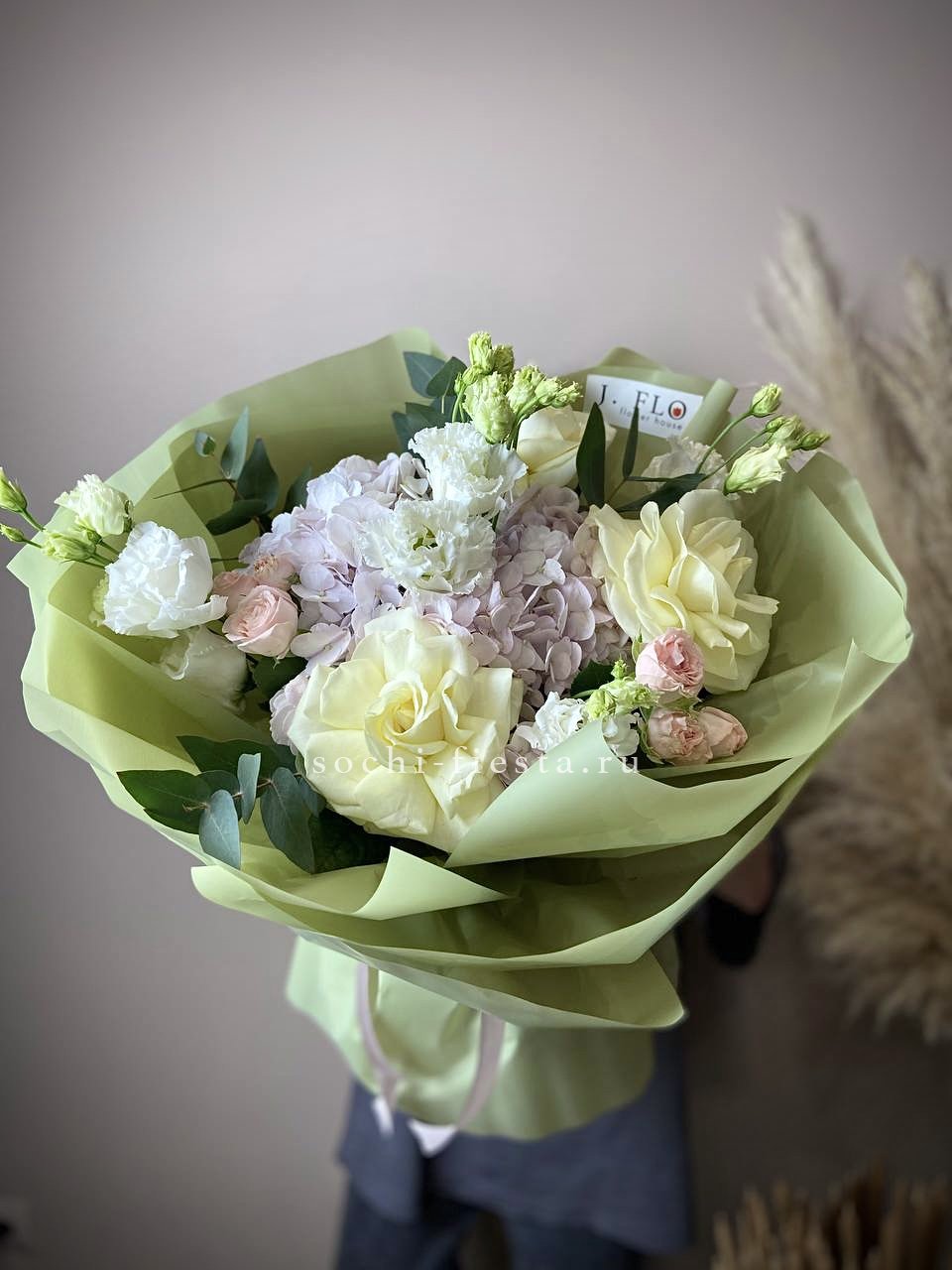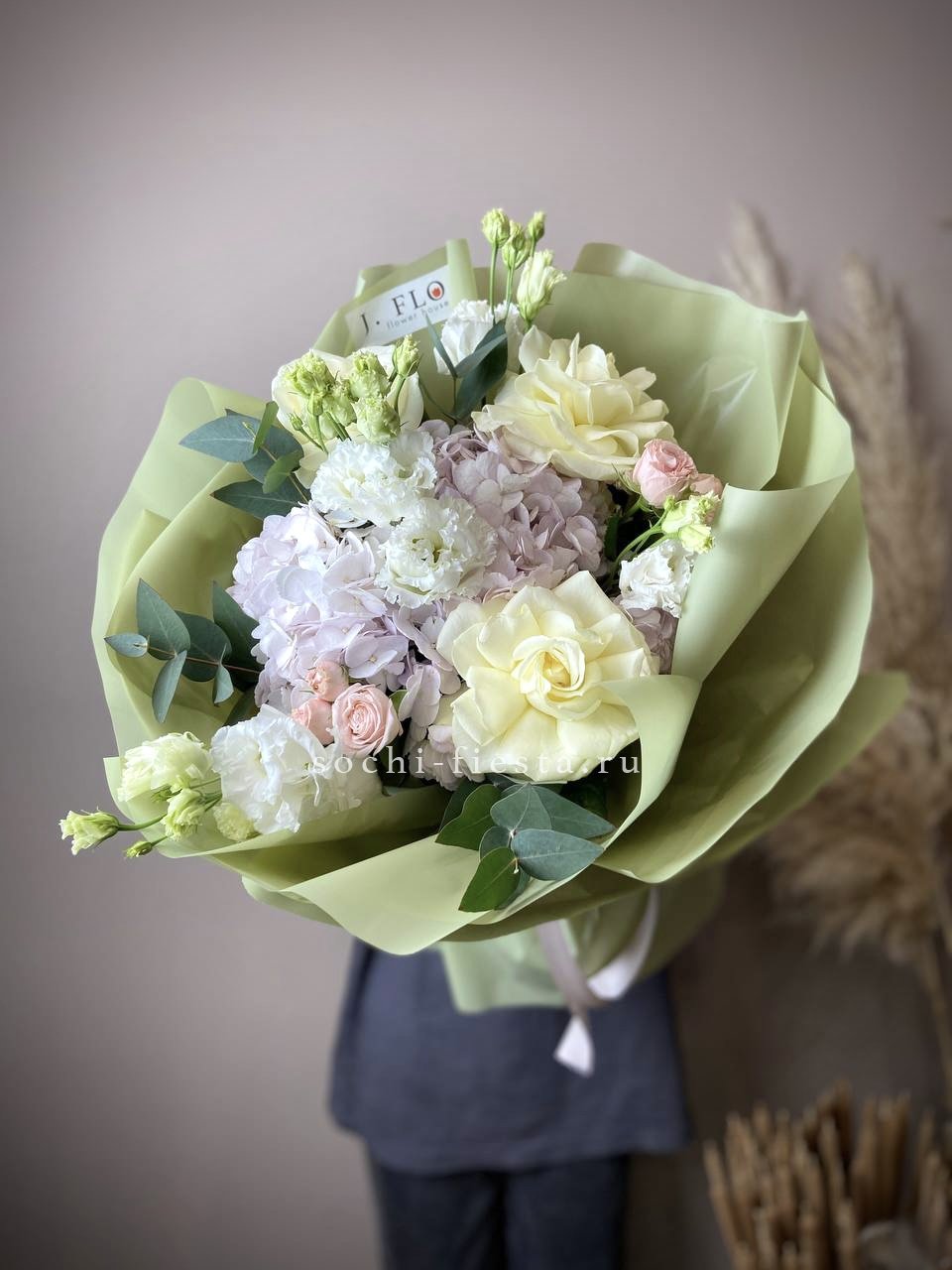 гортензия, хлопок, бомбастик, белая роза, маттиола- может меняться от сезона на диантус, ковыль, упаковка.