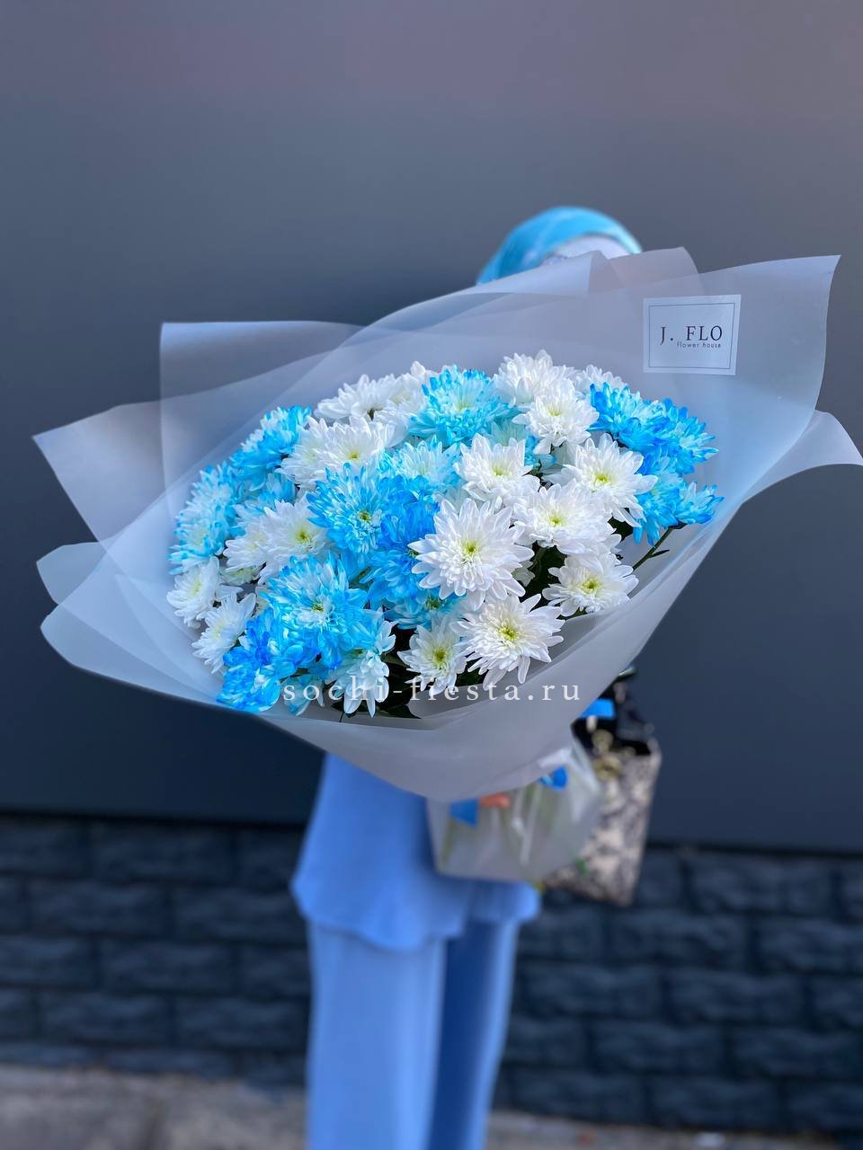 Одиннадцать кустовых хризантем окрашены в холодный голубой оттенок и собраны в плотную композицию. Каждая ветка раскрывается множеством бутонов, создавая объёмную шапку цвета зимнего неба.