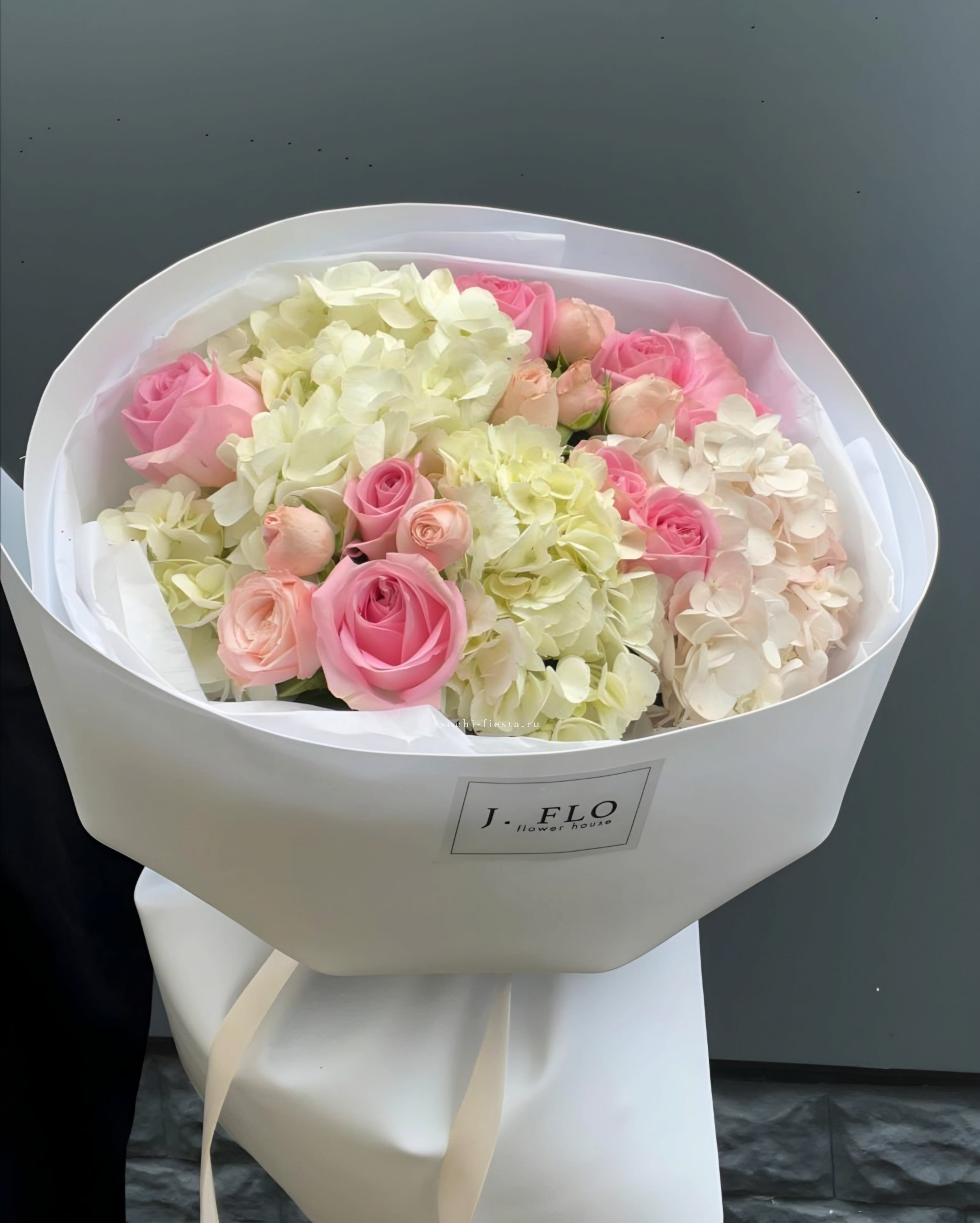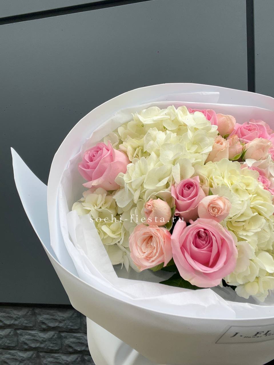 гортензия, хризантема, белая роза, гербера, статица, хлопок, упаковка.