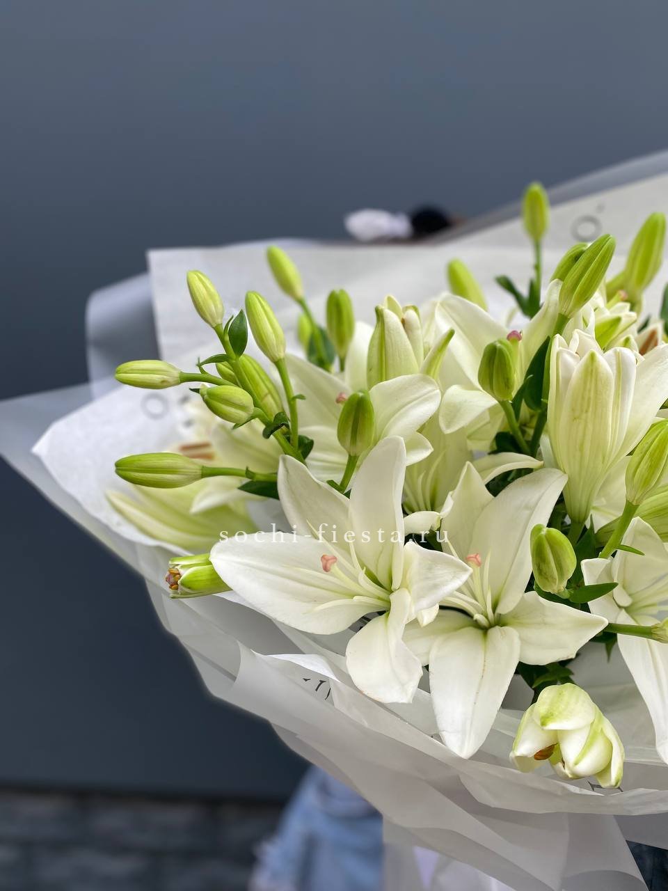 Семь лилий собраны в лёгкую композицию с вертикальным силуэтом. Бутоны раскрываются постепенно и наполняют пространство свежим ароматом. Букет подходит для интерьеров в светлых тонах и создаёт ощущение простора.