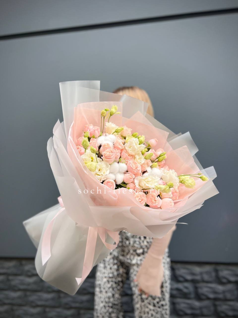 кустовые розы, эустома, хлопок, лента и дизайнерская пленка.