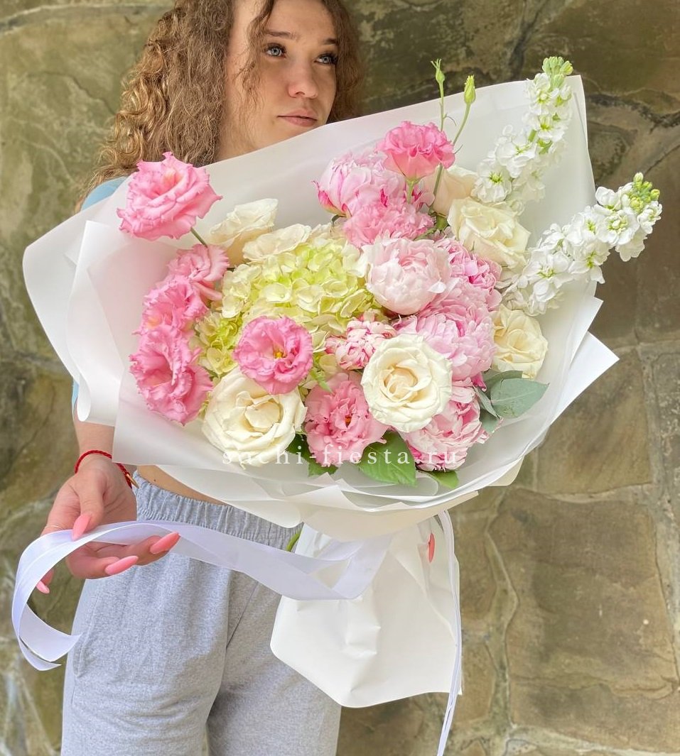 гортензия, розовые пионы Сара Бернар, розы белые, эустома, маттиола (замена вне сезона), эвкалипт, лента, дизайнерская упаковка.