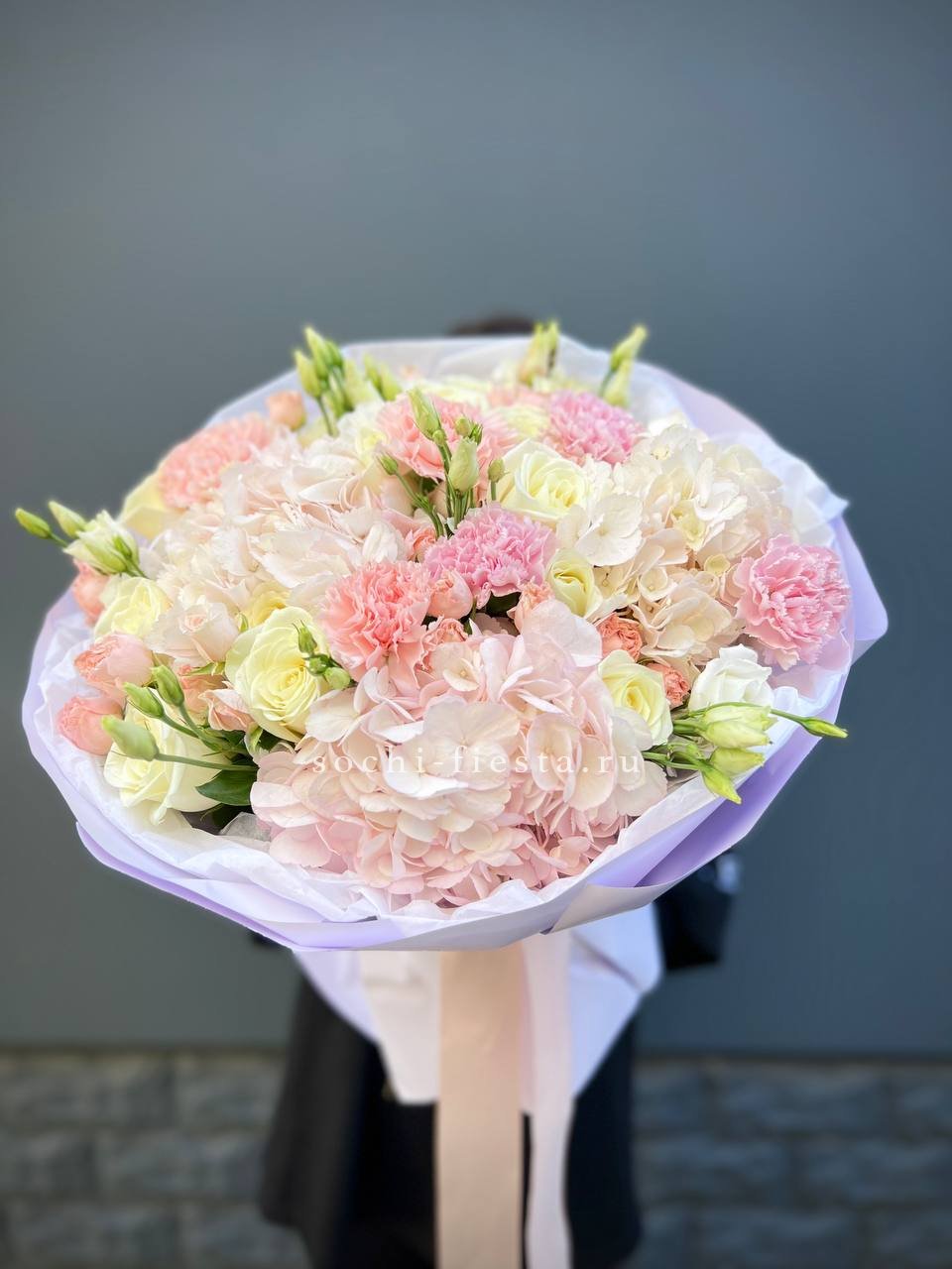 маттиола, розы, гортензия, диантусы, хризантемы , лента и дизайнерская пленка.
