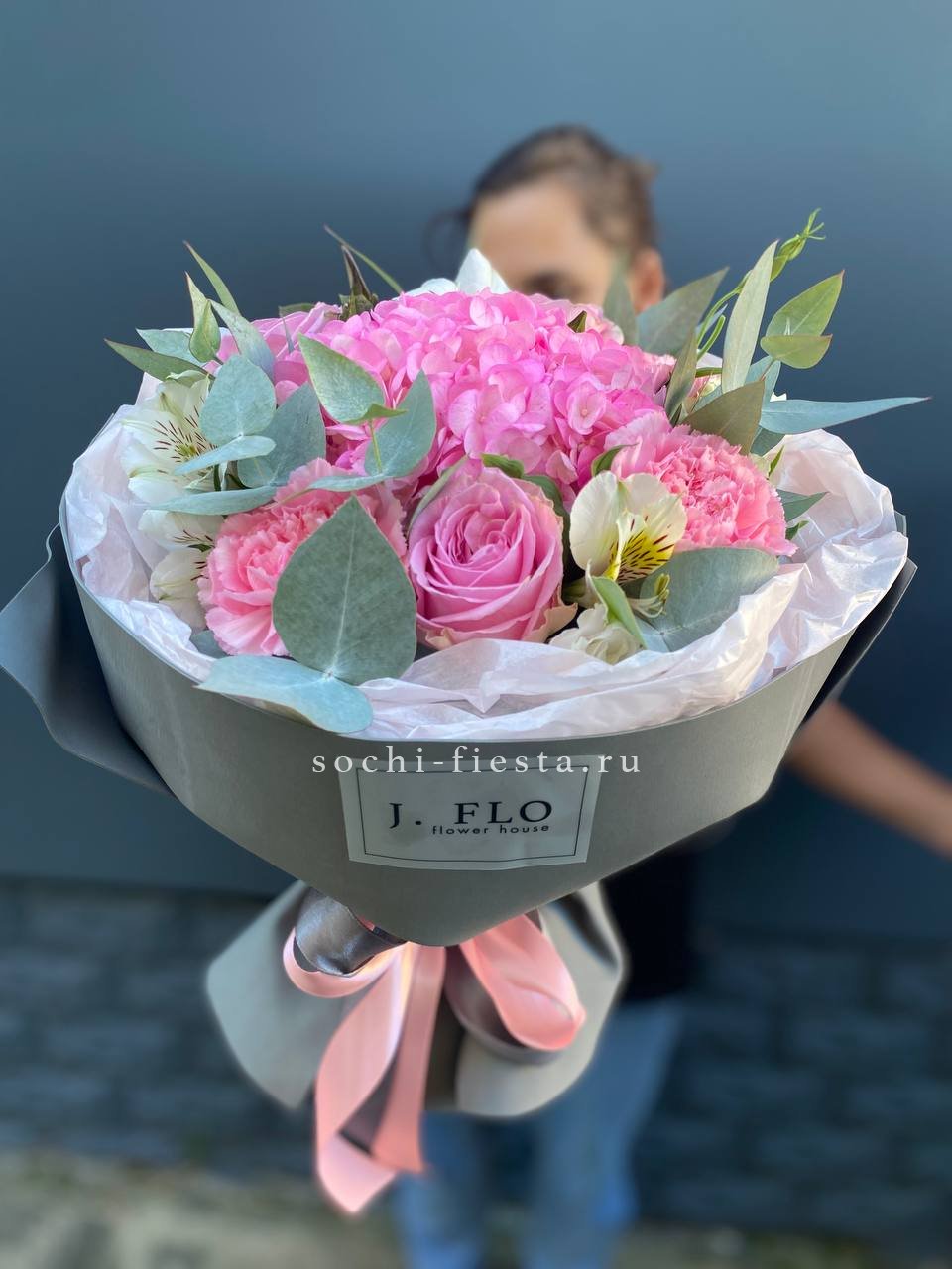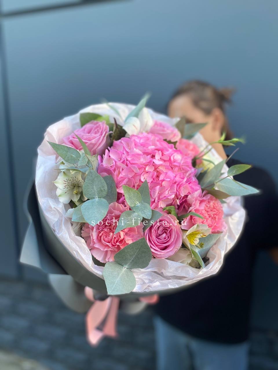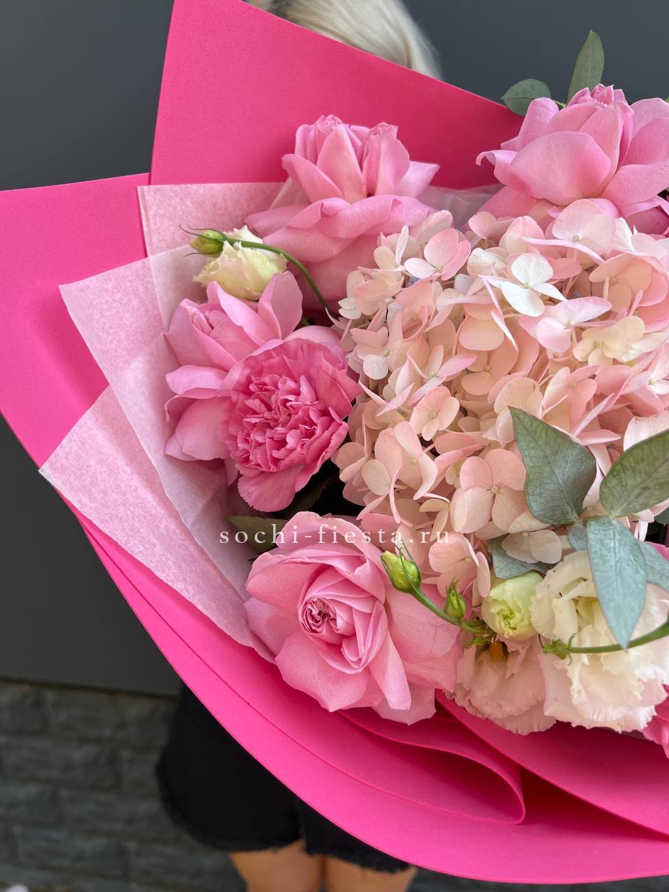 Диантусы создают воздушную текстуру между крупными бутонами роз в розовой и белой гамме. Эвкалипт добавляет графичности и свежести всей композиции.