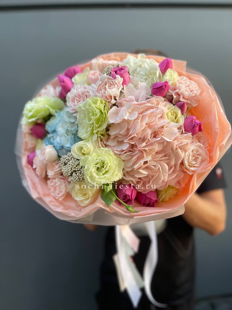 Крупные соцветия гортензии задают основной объем, а эустома и диантус разбивают плотность воздушными бутонами. Мисти баблс и озотамус рассыпаются между цветами, добавляя движение и легкость всей композиции.