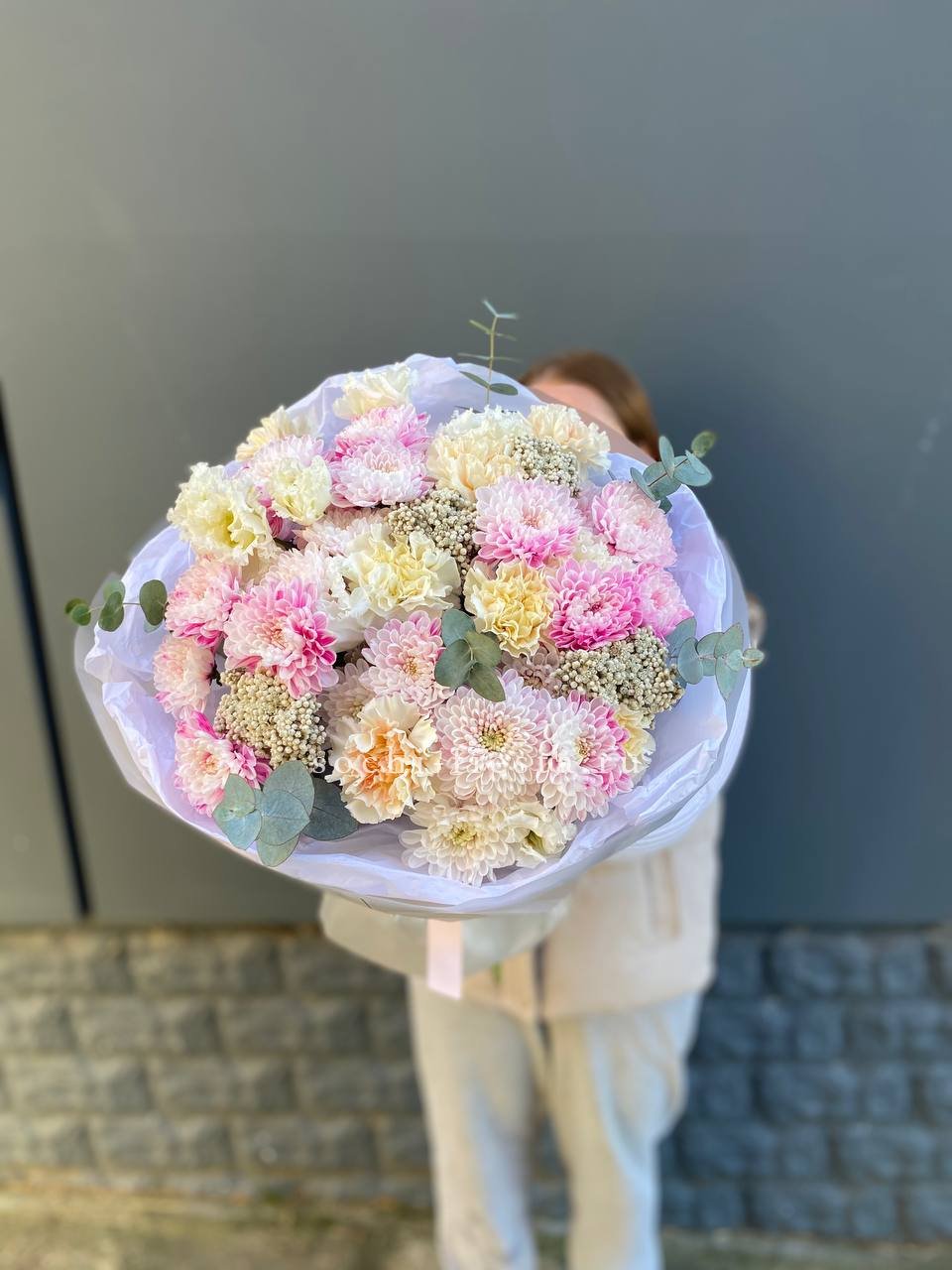 Воздушная композиция собирает кустовую хризантему, эустому и диантус в единый ритм. Озотамус и эвкалипт задают структуру, сохраняя свежесть надолго.