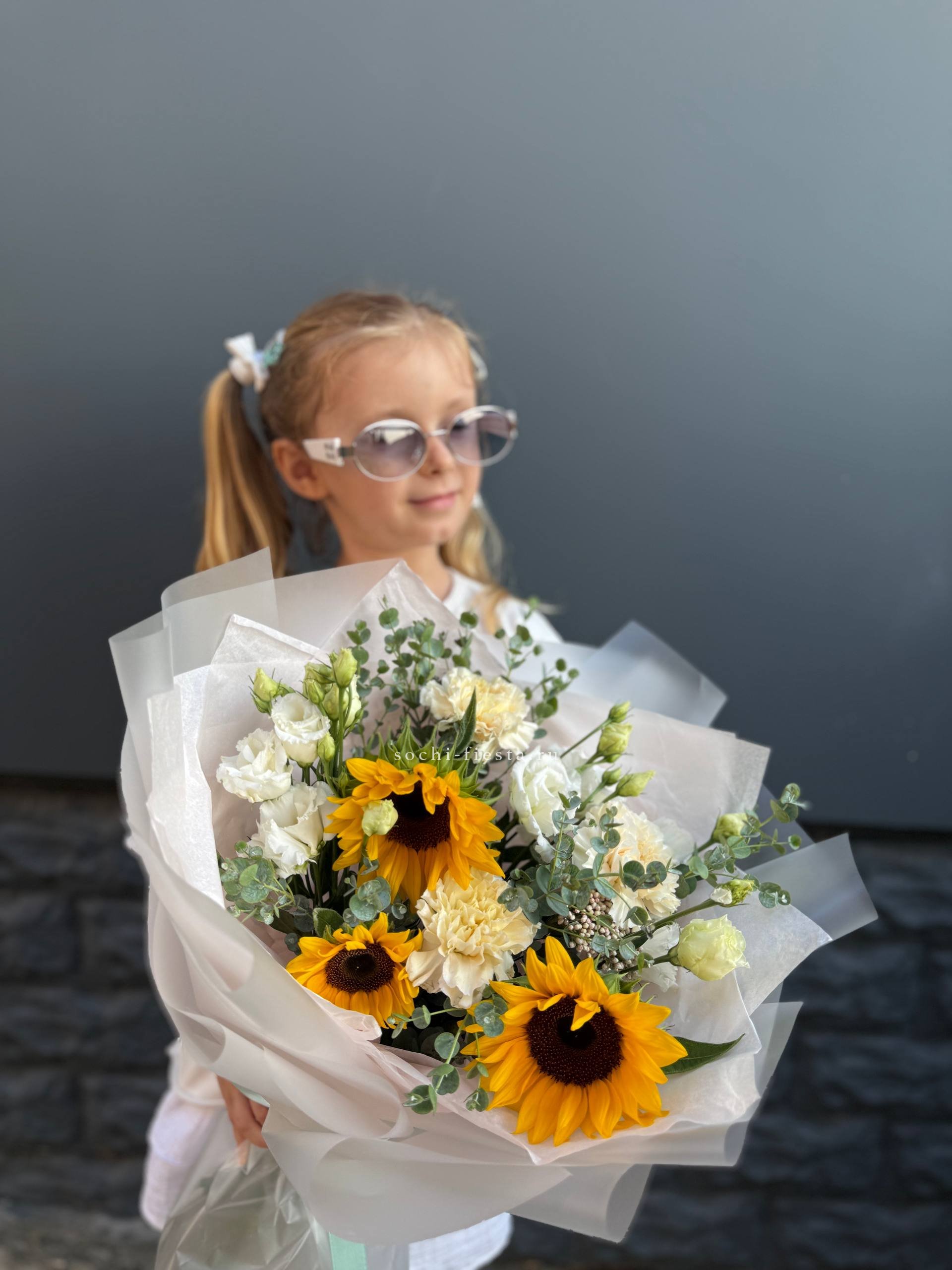 подсолнухи, диантусы, эустома, озатамус, эвкалипт, оформление.