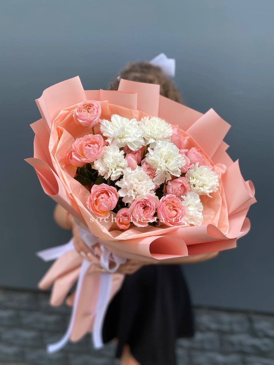 кустовые розы Джульетта и диантусы в нежном оформлении.