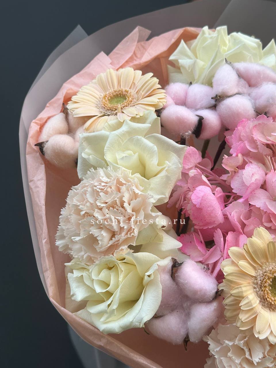 гортензия, хризантема, роза, эустома, упаковка, лента.