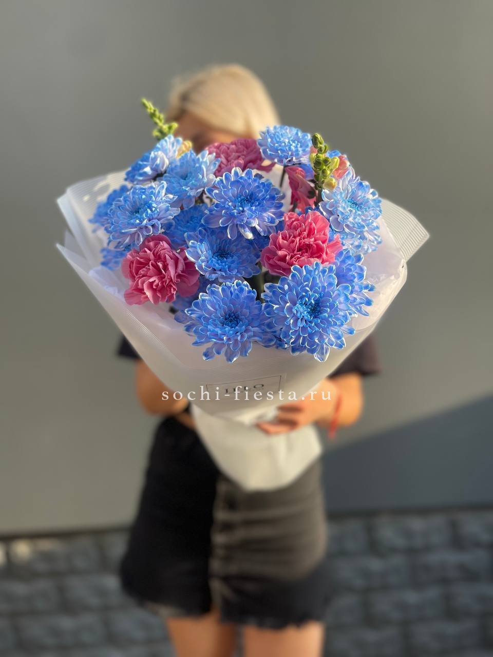 гортензия, бомбастик, диантусы, эвкалипт, антиринум, хризантема, пленка.
