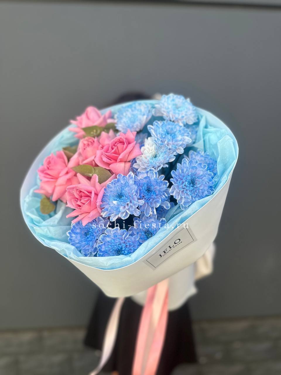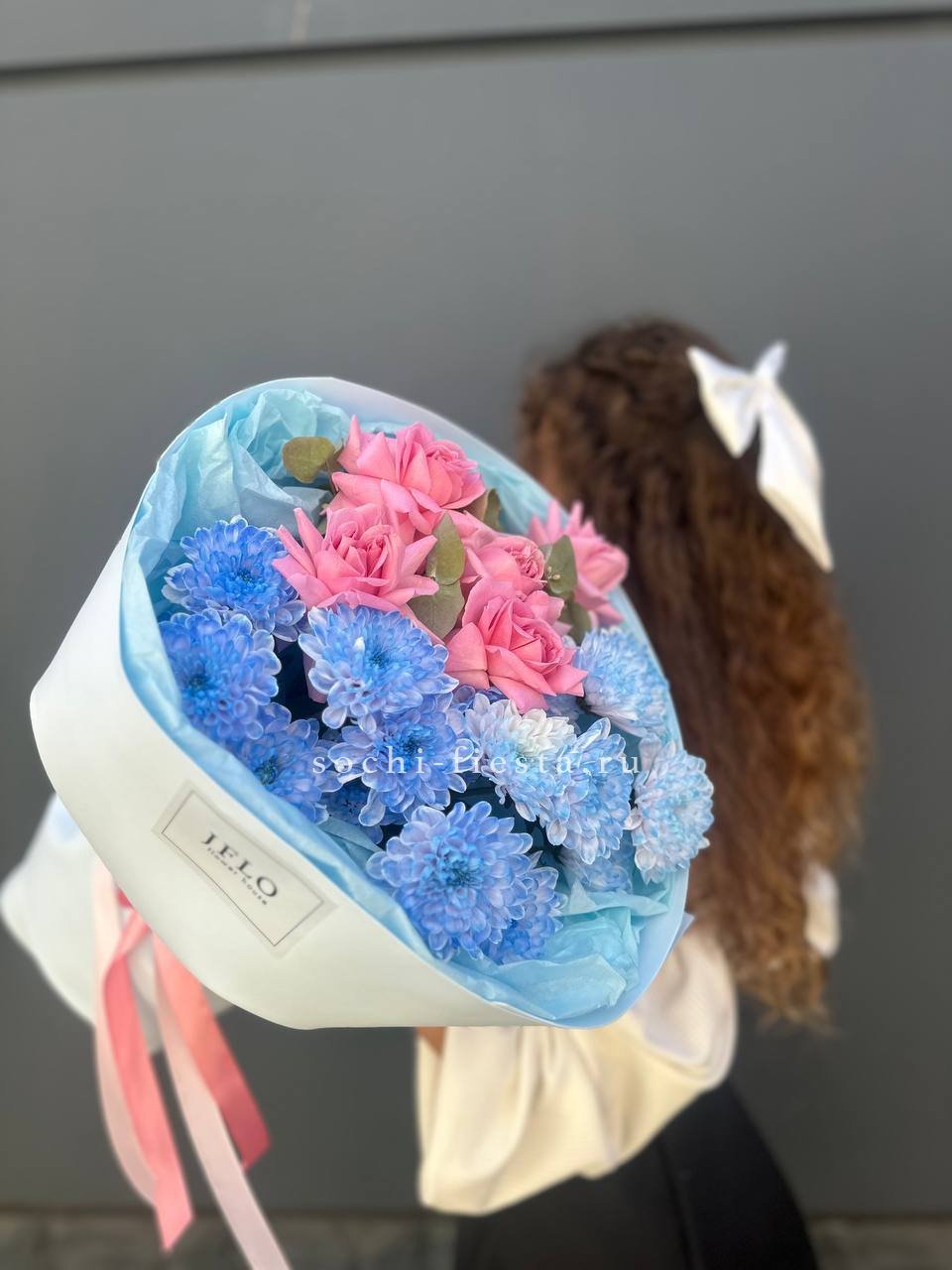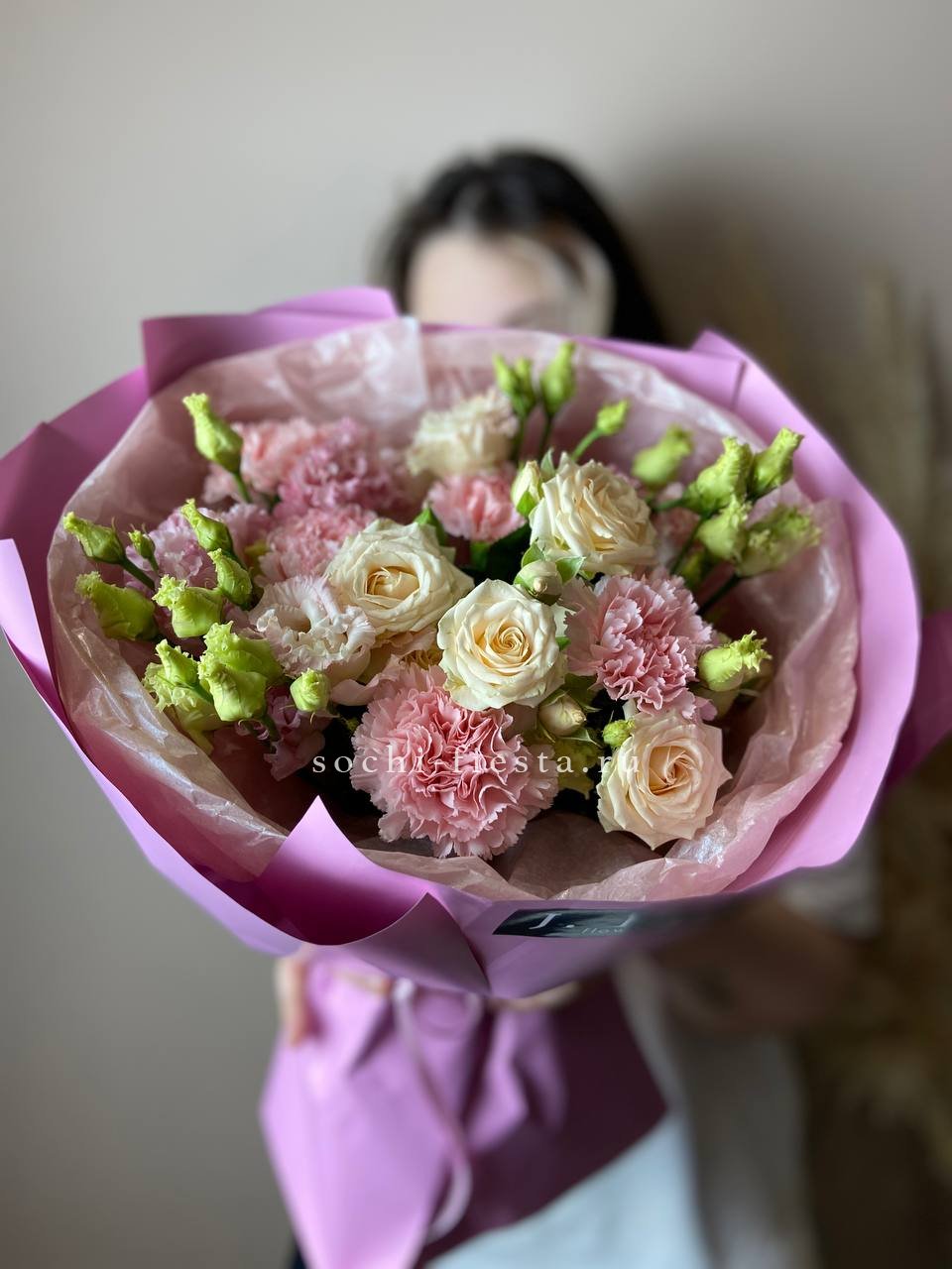 Розовые розы и диантусы окружены пышными соцветиями маттиолы и бомбастика. Композиция собрана плотно, каждый цветок поддерживает соседний, создавая объемную округлую форму. Букет держит силуэт и выглядит цельно с любого ракурса.