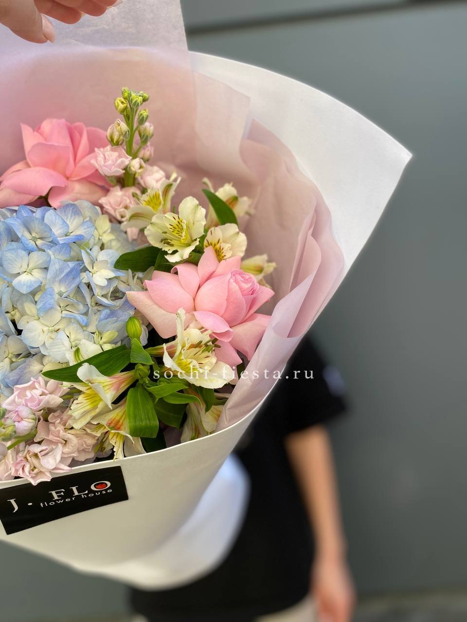 розовая роза, диантус, бомбастик, маттиола в нежном оформлении.