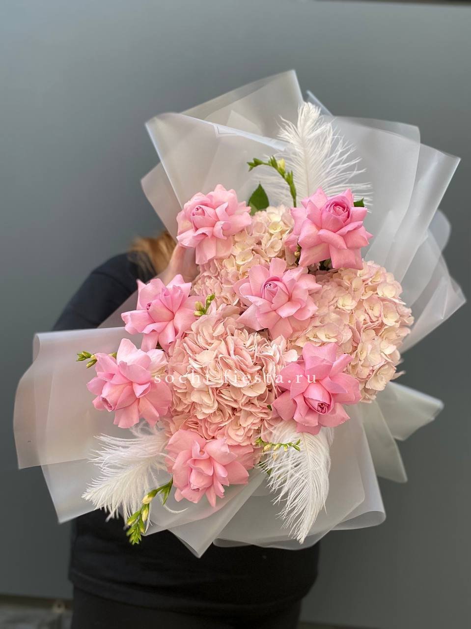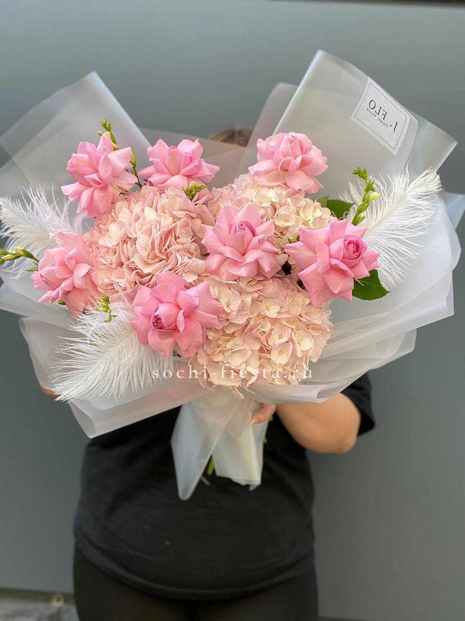 гортензия, диантус, хризантема, бомбастик, озатамус, пленка.