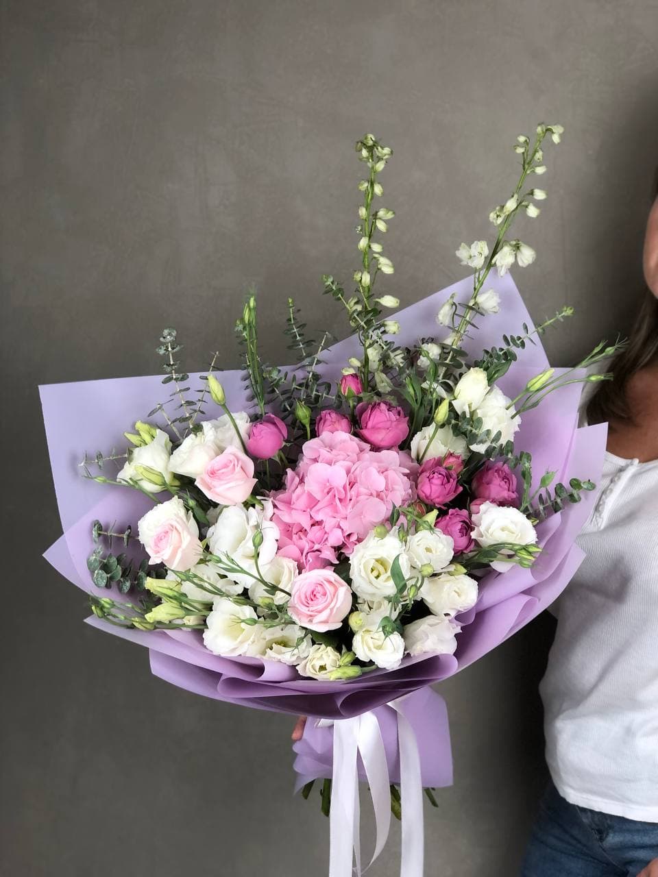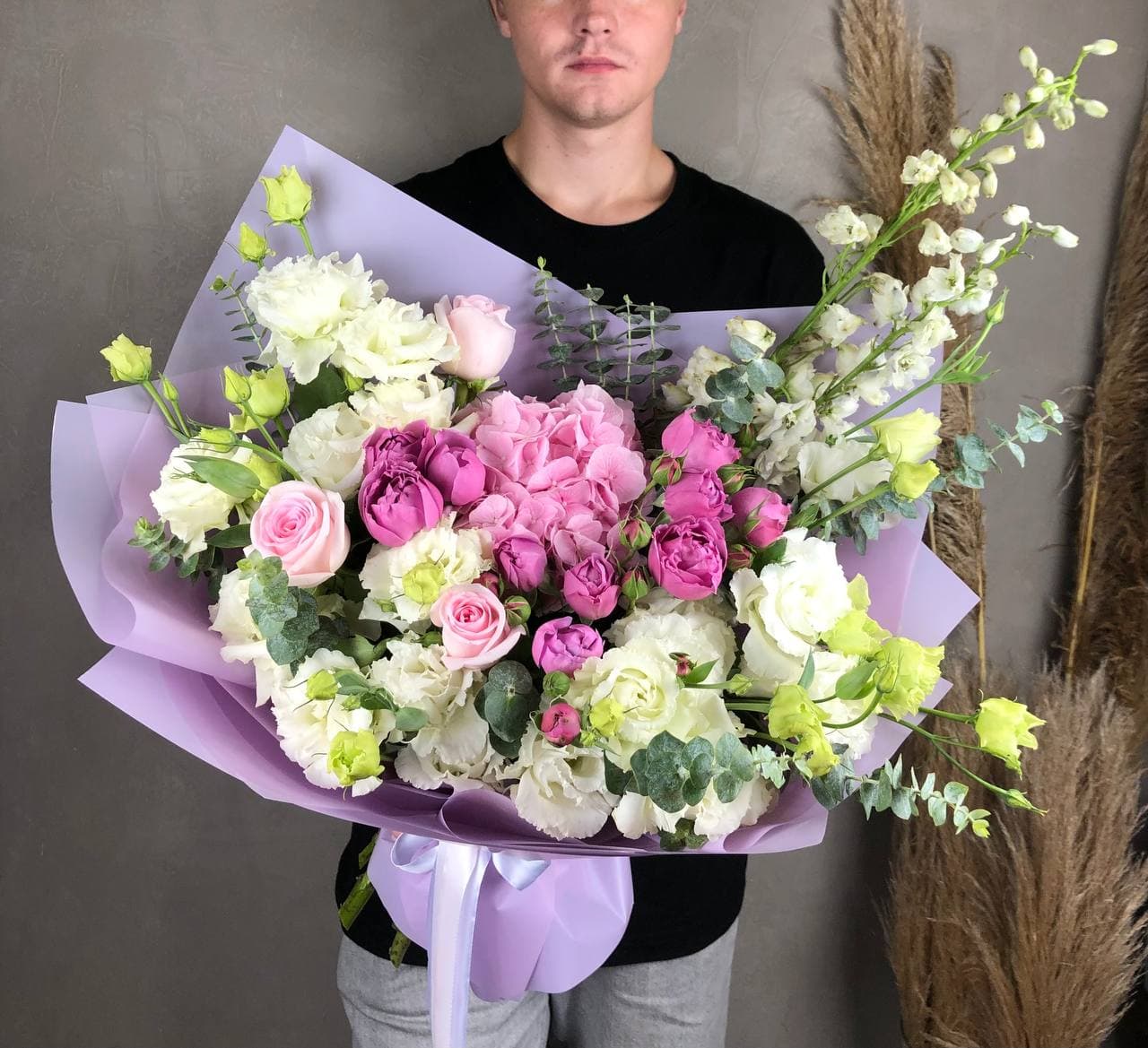 Воздушная композиция с крупными соцветиями гортензии и пышными розами создает ощущение легкости и объема. Эвкалипт добавляет свежести, а бомбастик расставляет яркие акценты между бутонами.