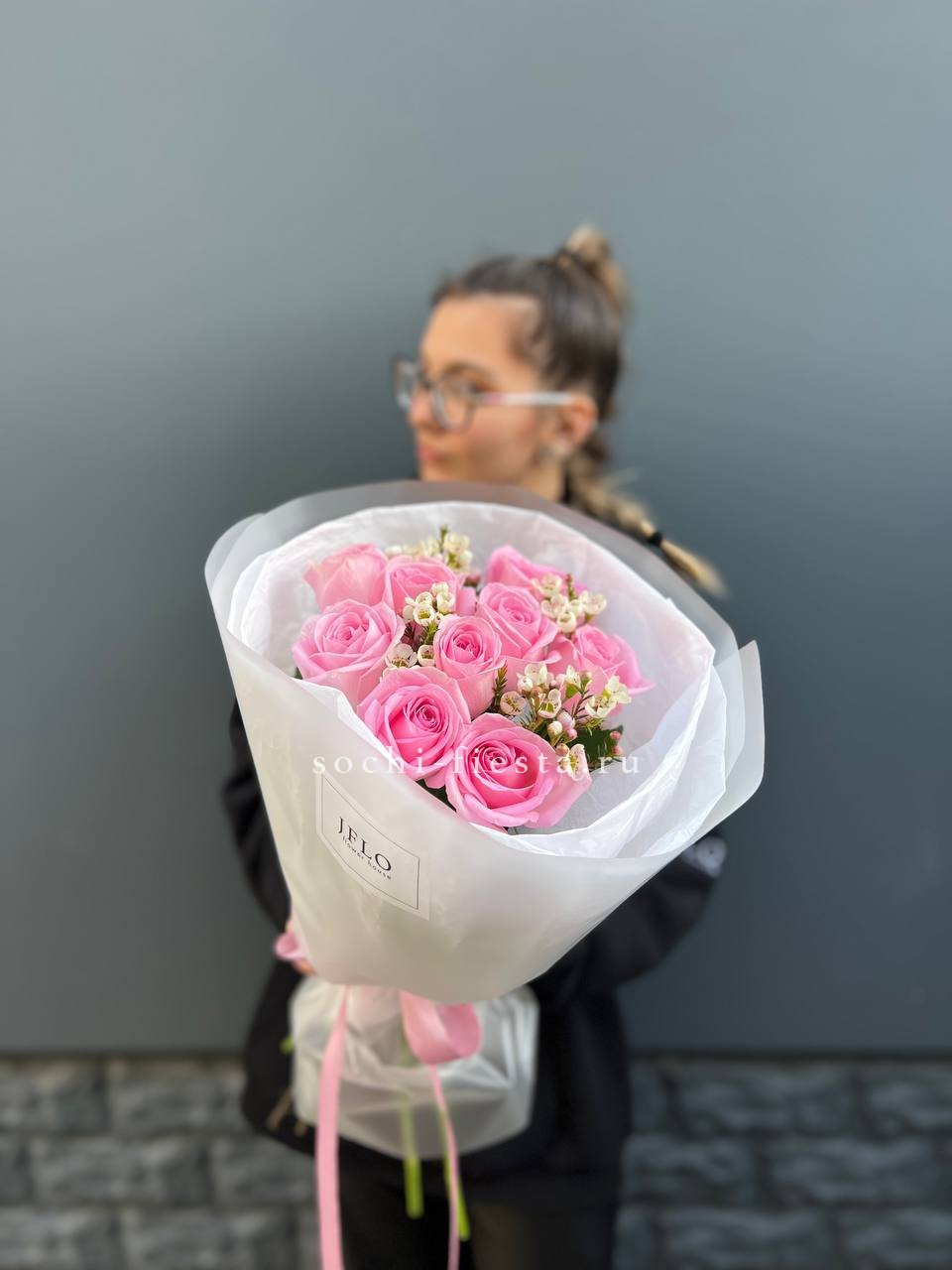Классическая сборка из розовых роз с хамелациумом дополняет пространство мягким цветом и стойкостью формы. Бутоны долго сохраняют свежесть и не требуют сложного ухода.