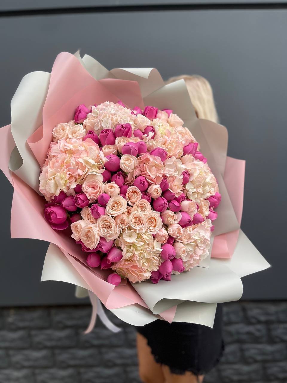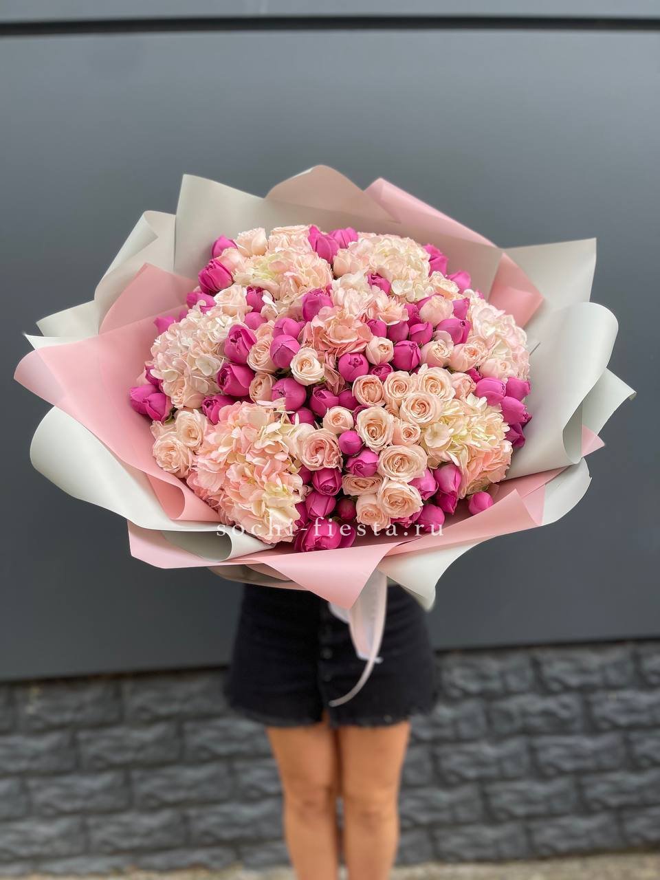 роза одноголовая, кустовая роза, альстромерия, гортензия, эустома, эвкалипт, декоративная зелень, лента, крафт.