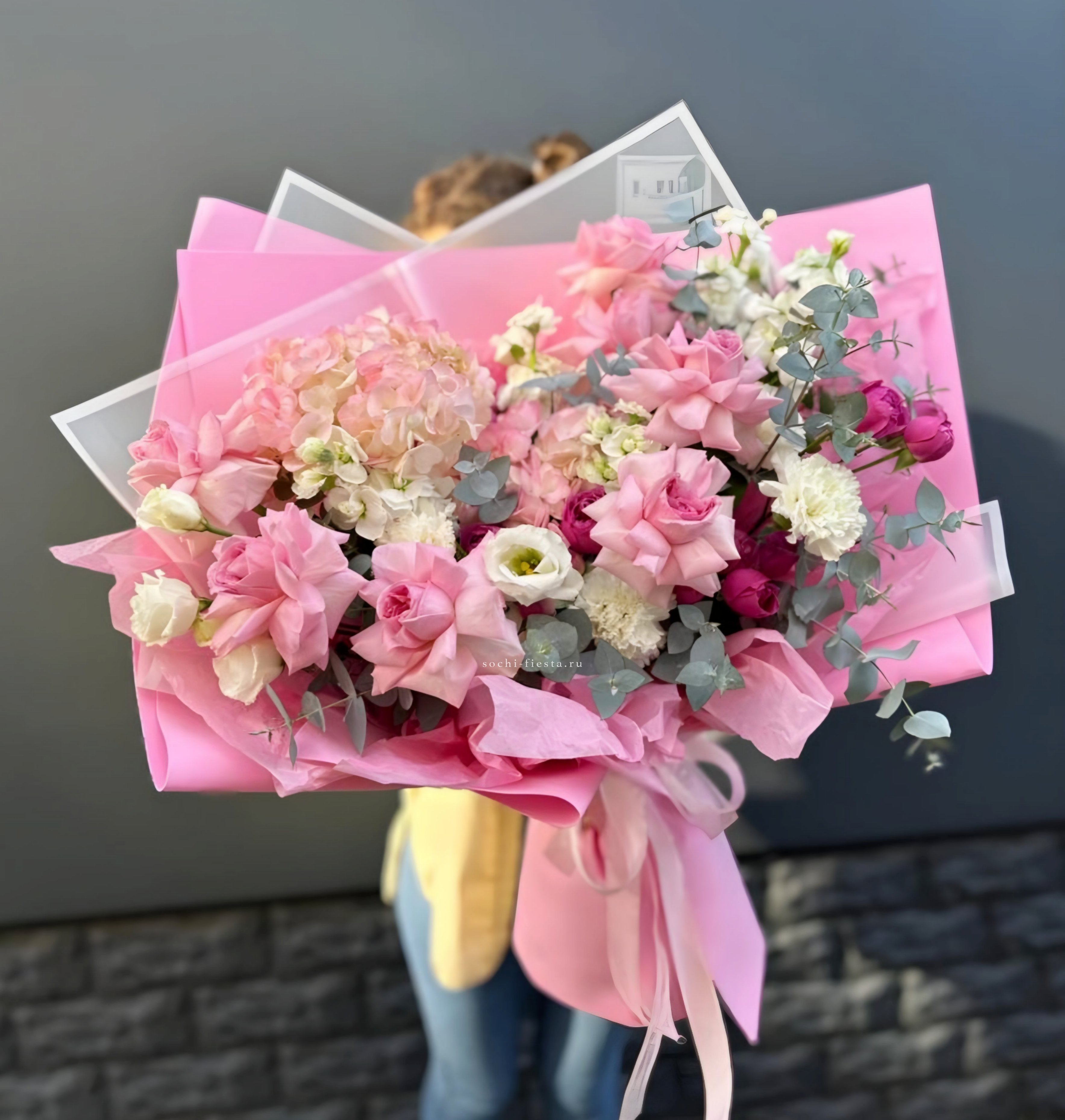 Диантусы и маттиола добавляют букету душистую лёгкость, а гортензия создаёт объёмную основу. Мисти баблс и эвкалипт рисуют воздушный контур вокруг розовых оттенков.