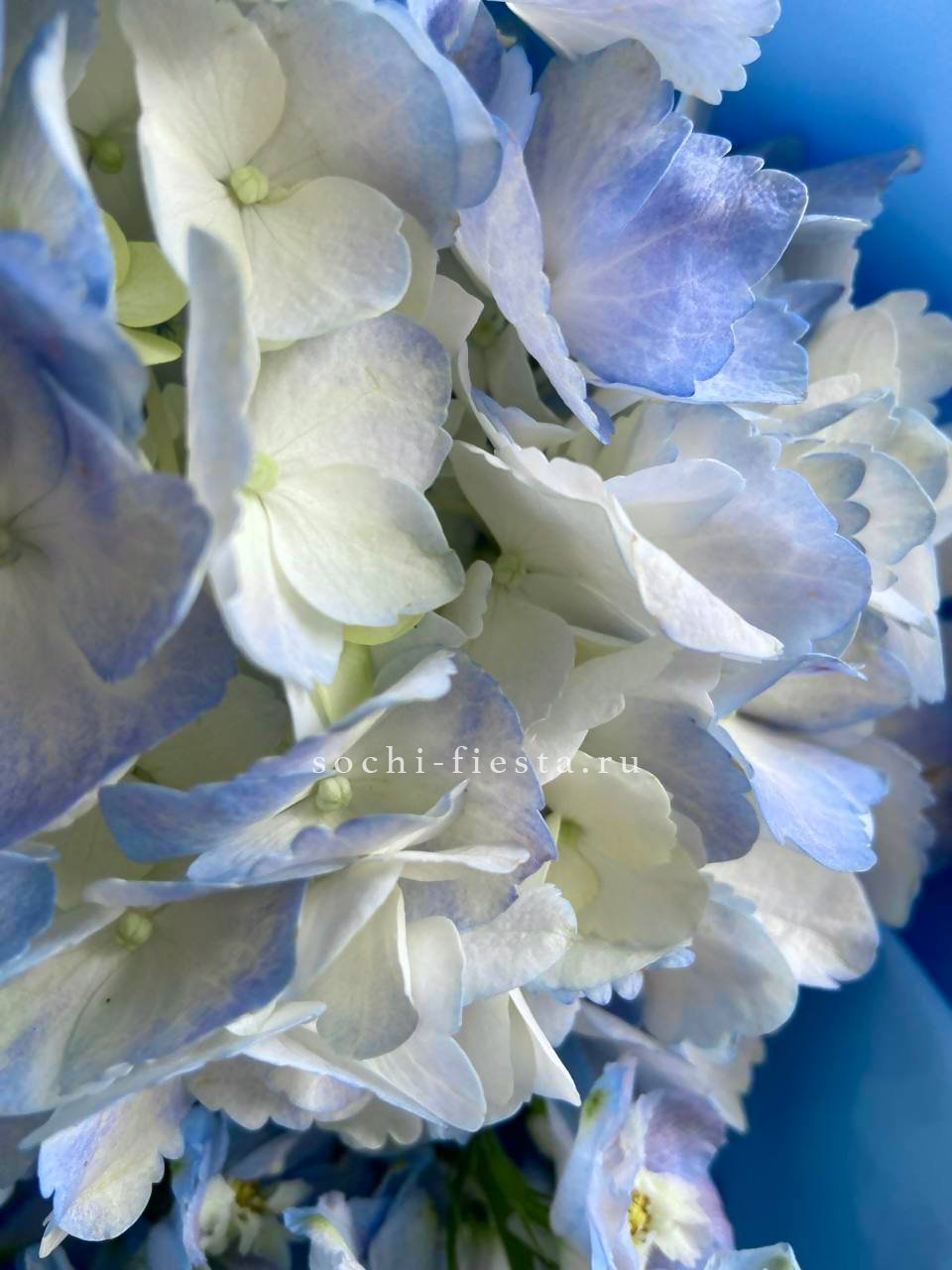 Яркий микс голубых и синих оттенков создает ощущение прохлады и воздуха. Пышные шапки гортензии переплетаются с вертикальными линиями дельфиниума, формируя объемную композицию с выразительным силуэтом.