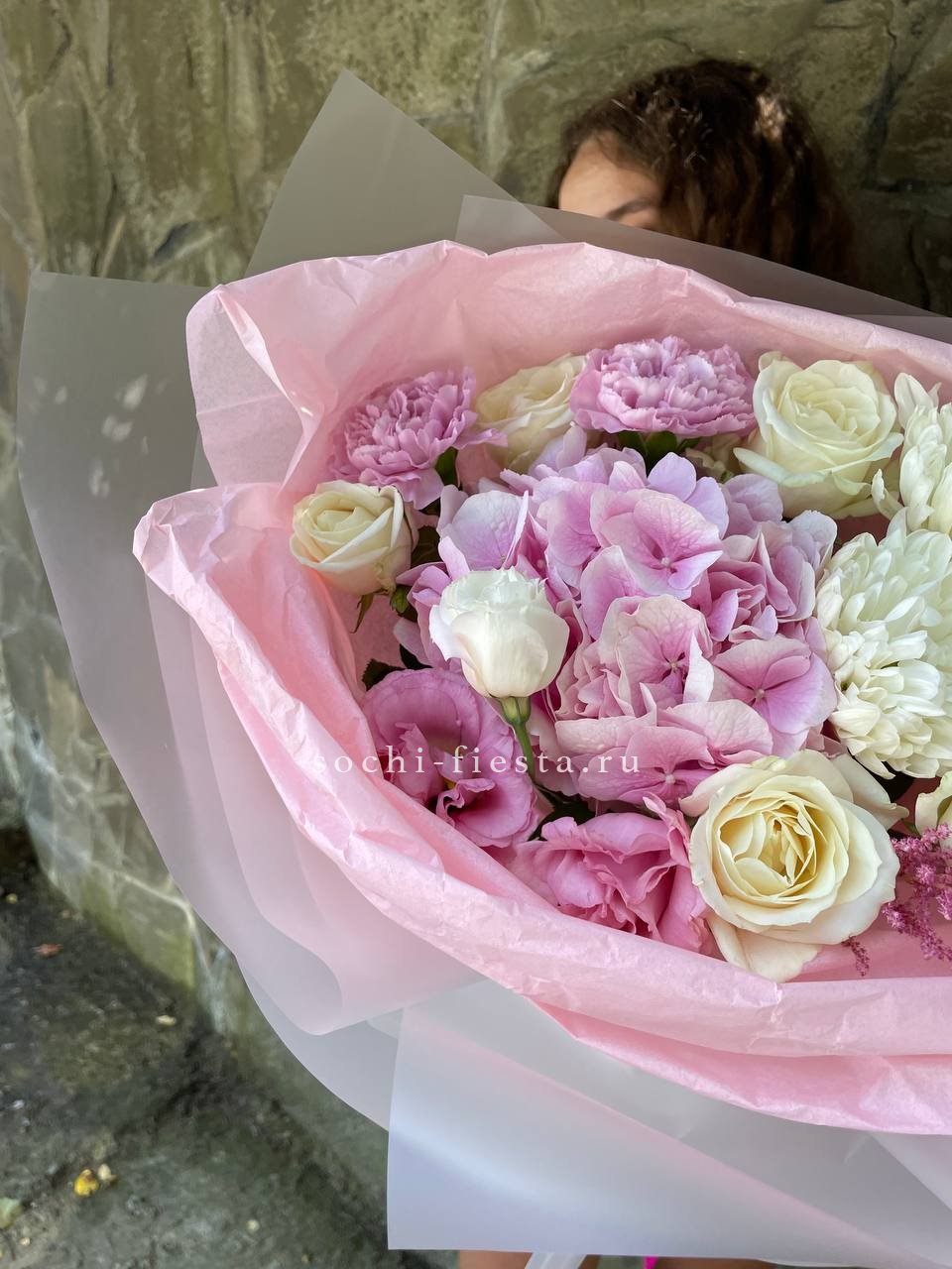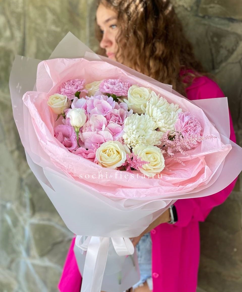 Букет объединяет хризантемы, диантусы, розы, эустому и гортензию в плотную композицию. Корейская пленка удерживает форму и создает графичный силуэт с четкими границами.