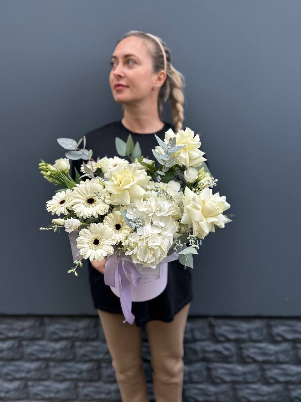 гортензия, герберы, розы французские, эустомы, эвкалипт, оазис, шляпная коробка, пленка, лента.