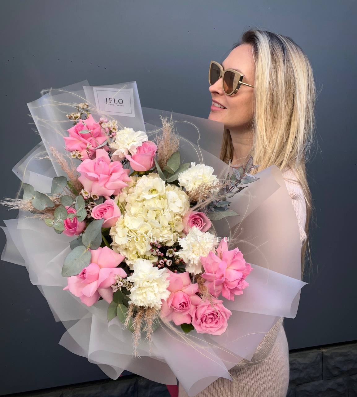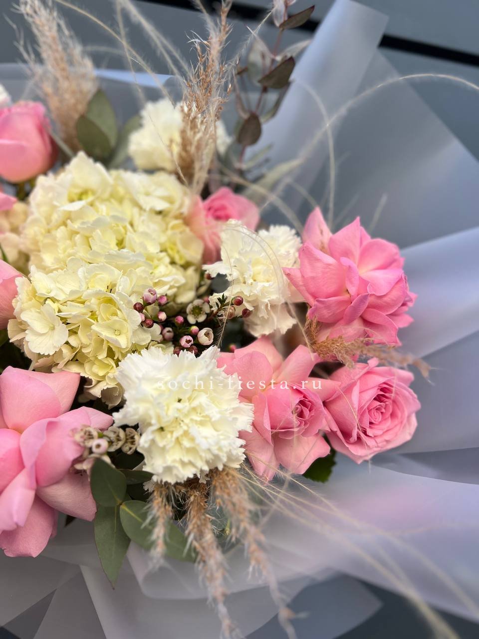 Плавные линии пышных соцветий гортензии переходят в округлые формы пионовидных роз и воздушные бутоны эустомы. Диантусы добавляют графичности, а дизайнерское оформление задает общий ритм композиции. Букет для пространств с характером.