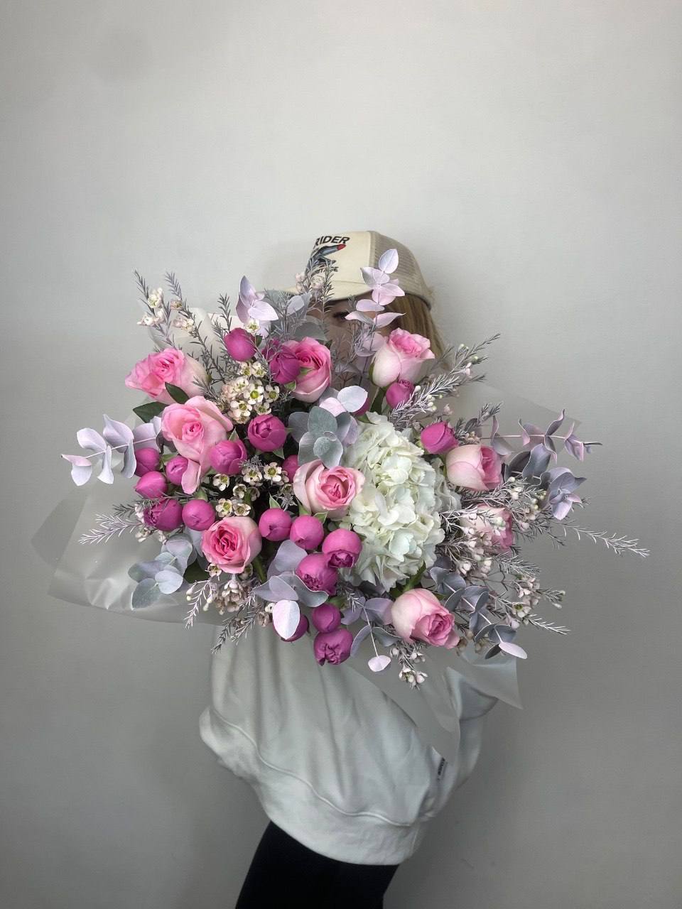 Плотная сборка с открытыми бутонами роз и воздушными соцветиями гортензии создаёт многослойную композицию. Белые каллы и маттиола добавляют вертикальные линии, а эвкалипт смягчает переходы между крупными формами.