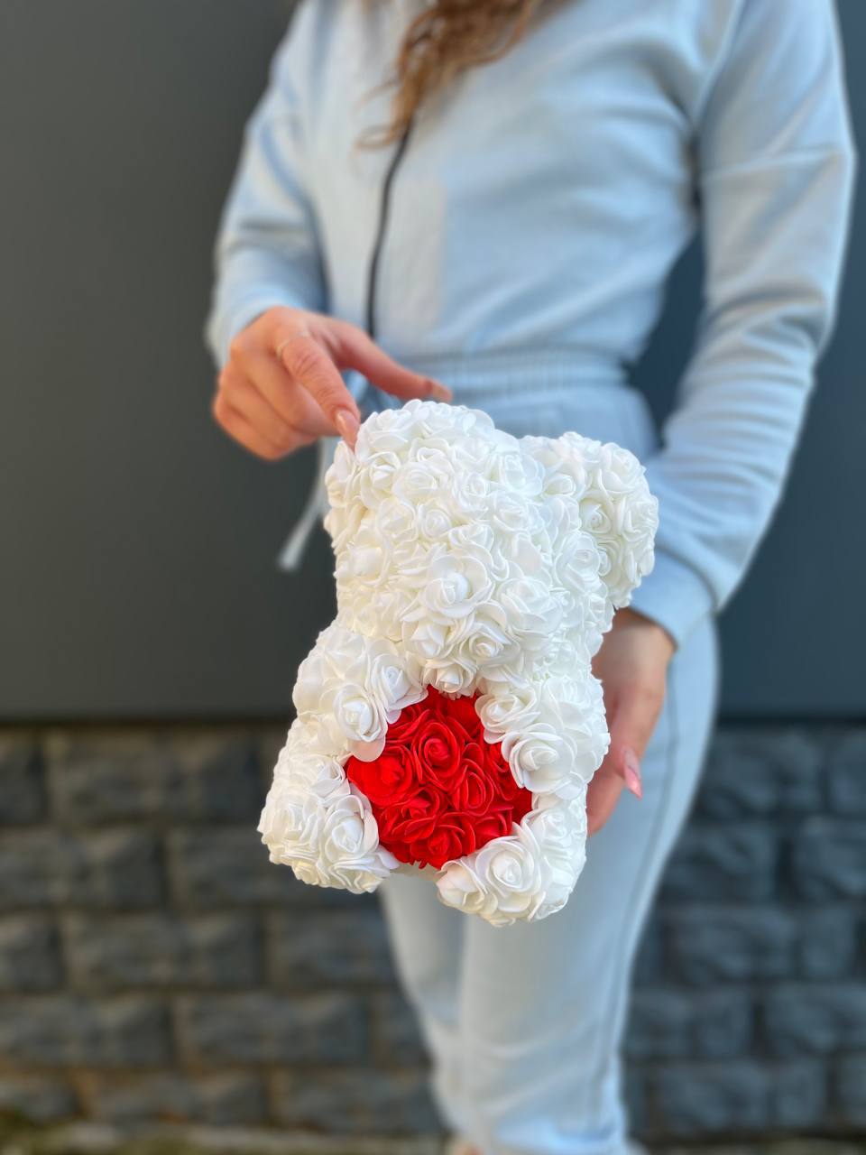медведь из PE материала фоамирана (цвет белый с красной сердцевиной). Доставка данной товарной единицы бесплатна при условии её заказа с цветами.