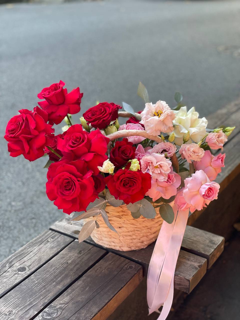 розовые розы, красная роза, эустома, эвкалипт, корзина малая.