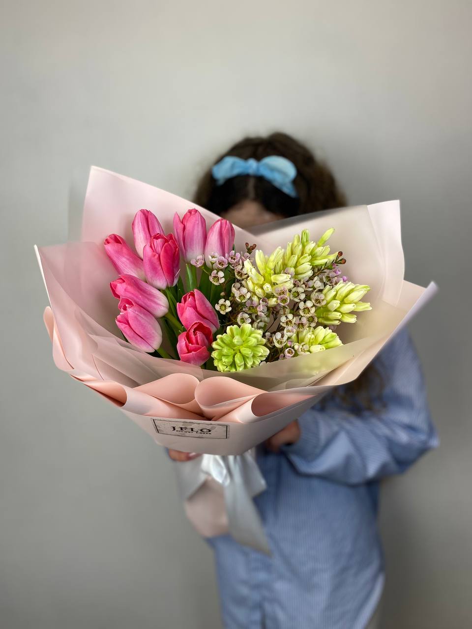 Весенний дуэт тюльпанов и гиацинтов собран в плотную композицию с воздушными веточками хамелациума. Бутоны раскрываются постепенно, наполняя пространство свежим ароматом и яркими красками. Букет сохраняет форму и радует несколько дней подряд.