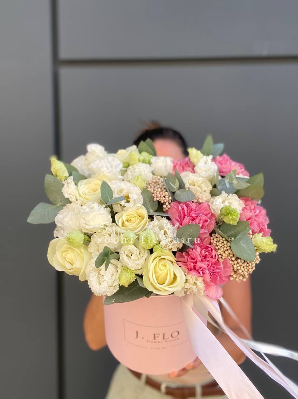 Белоснежные розы и воздушная эустома соседствуют с пышной гортензией и яркими вспышками статицы. Композиция собрана плотно, каждый цветок находит своё место в общем ритме.