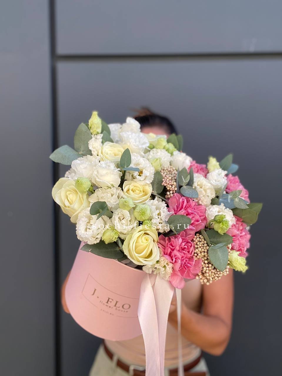 эустома, гортензия, белая роза, диантус, статица, бомбастик, бокс.