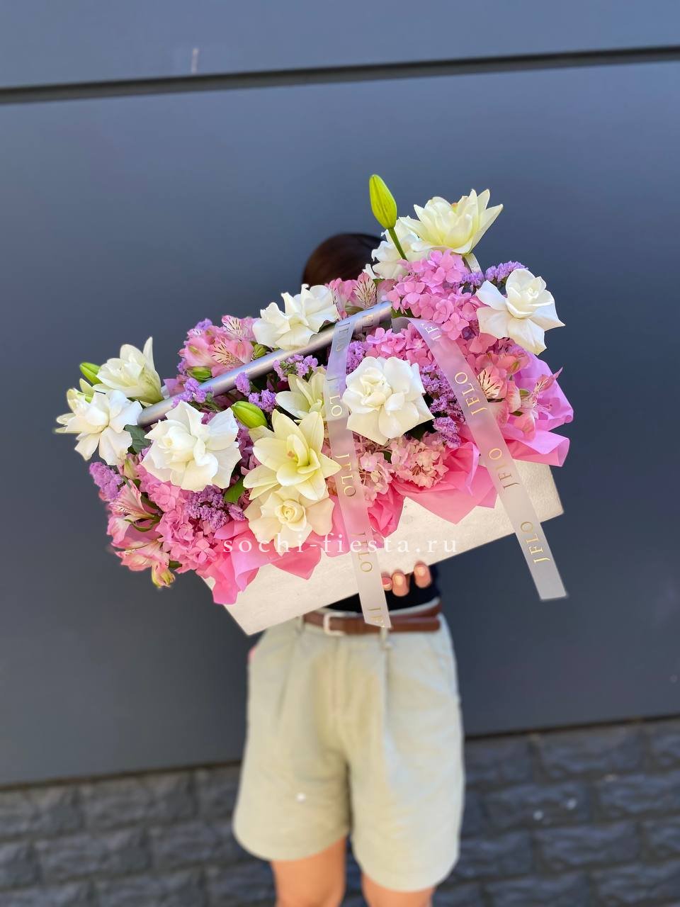 Лилии задают вертикальный ритм композиции, а французские розы и гортензия заполняют объем мягкими переходами формы. Альстромерия и статица добавляют графичности общему силуэту.