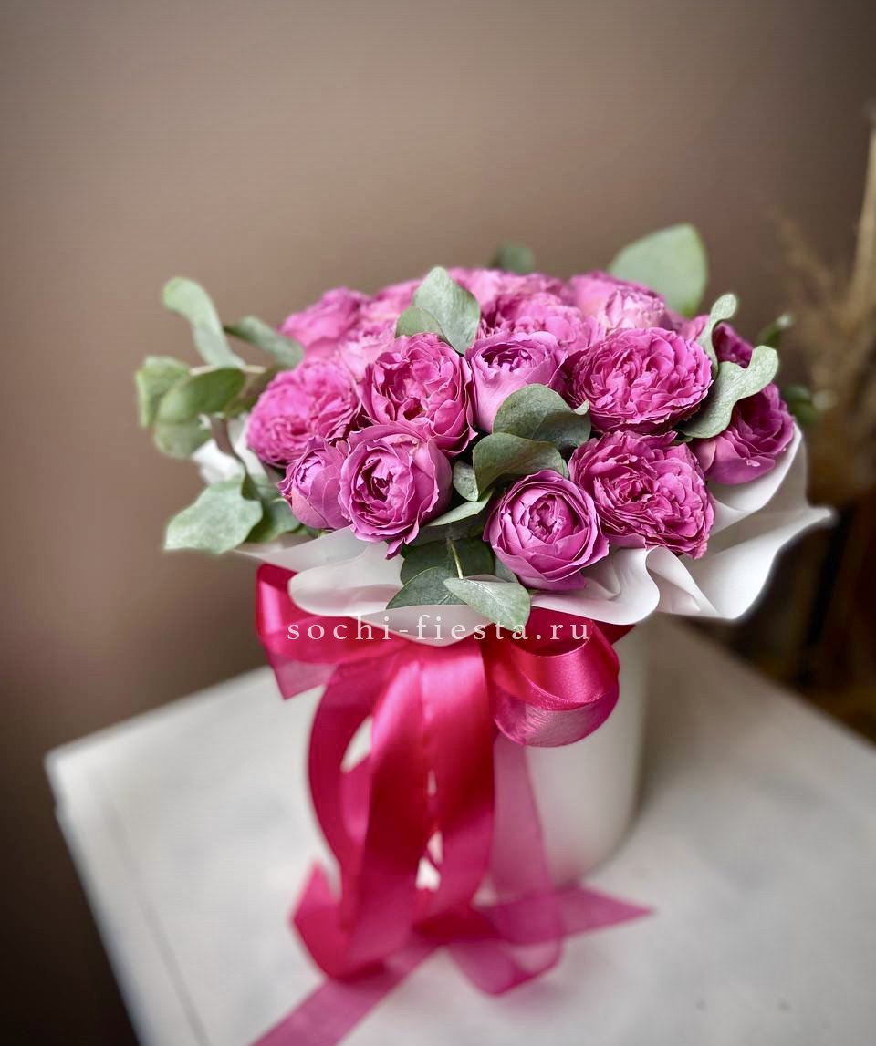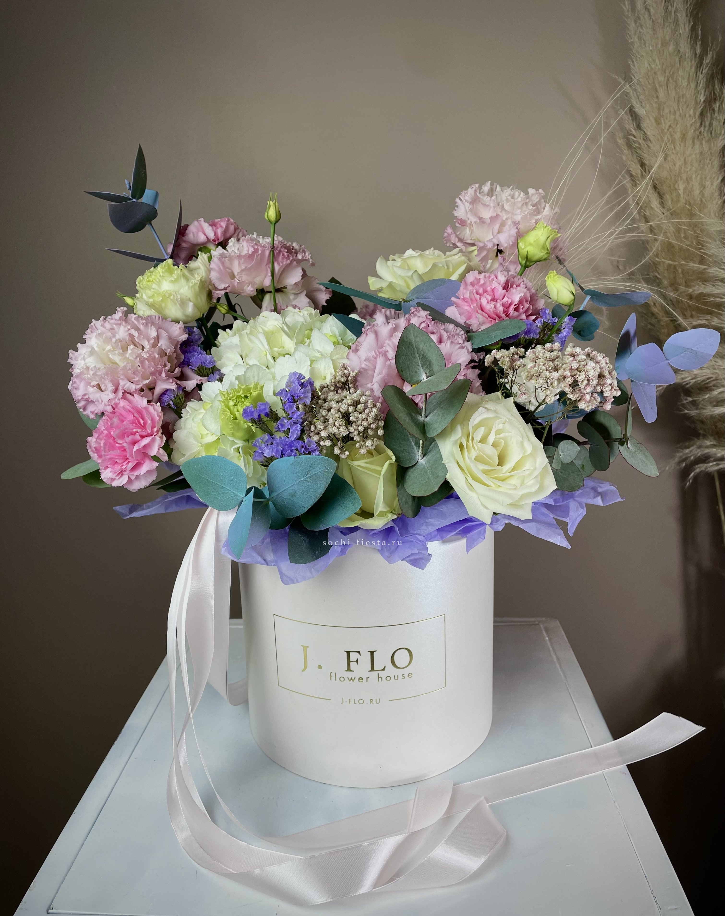 гортензия, вывернутые розы, диантус, кустовая роза, эустома, бокс D20, тишью.