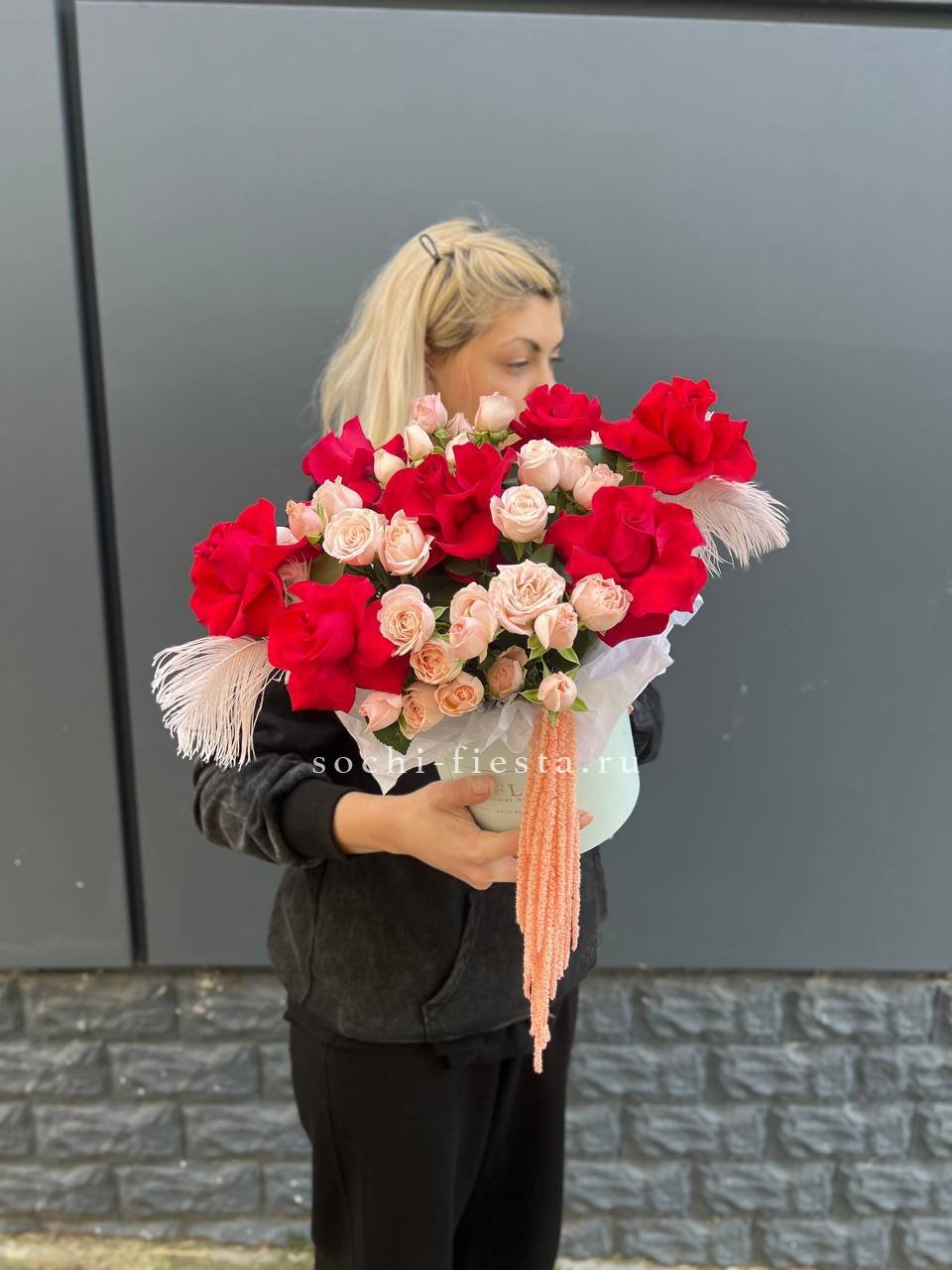 Вывернутые лепестки роз открывают внутреннюю текстуру бутонов и добавляют объема композиции. Гортензия и эустома заполняют пространство между крупными головками и создают многослойность.