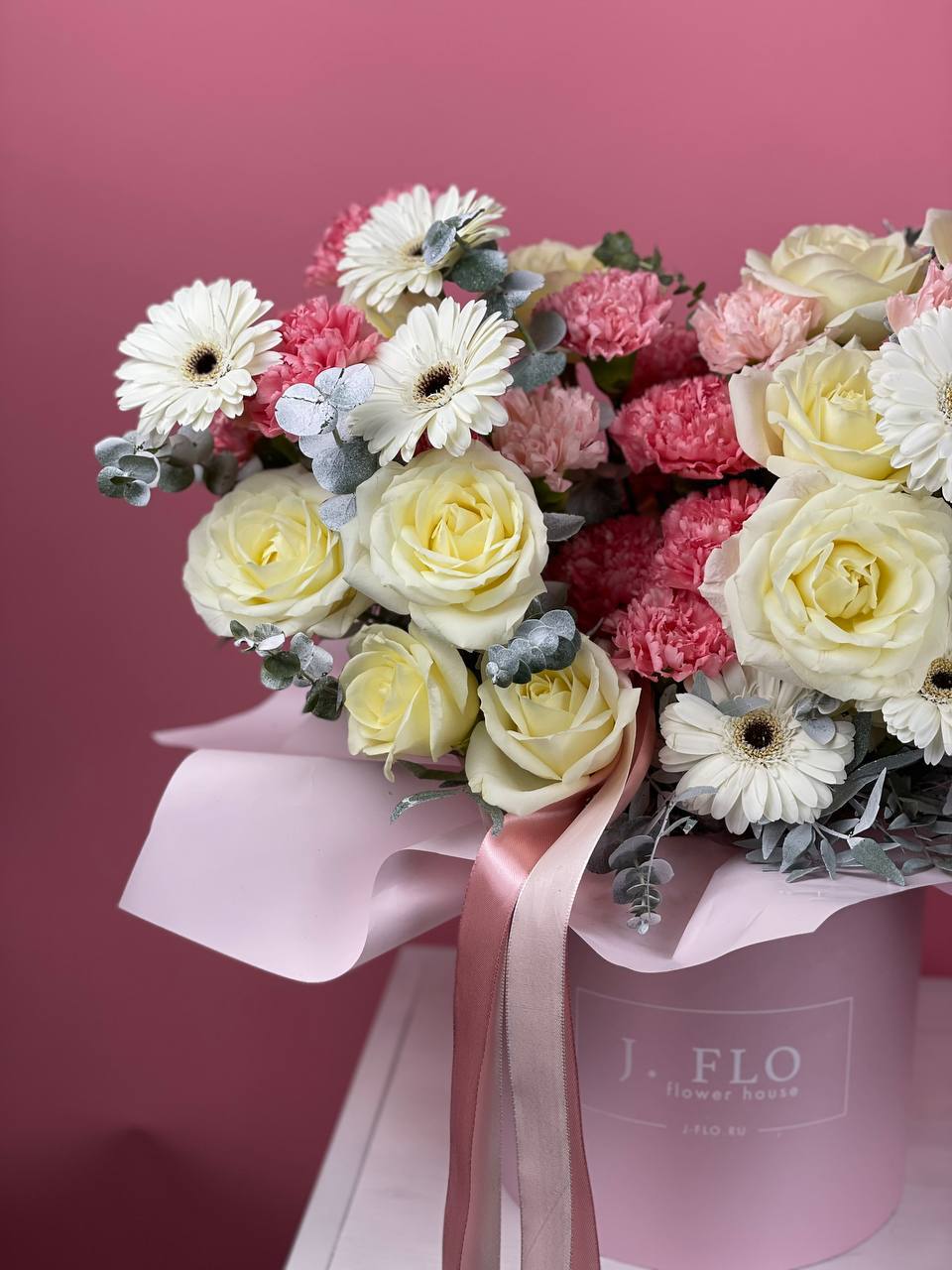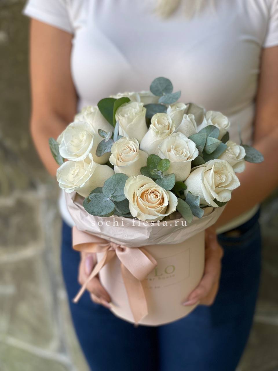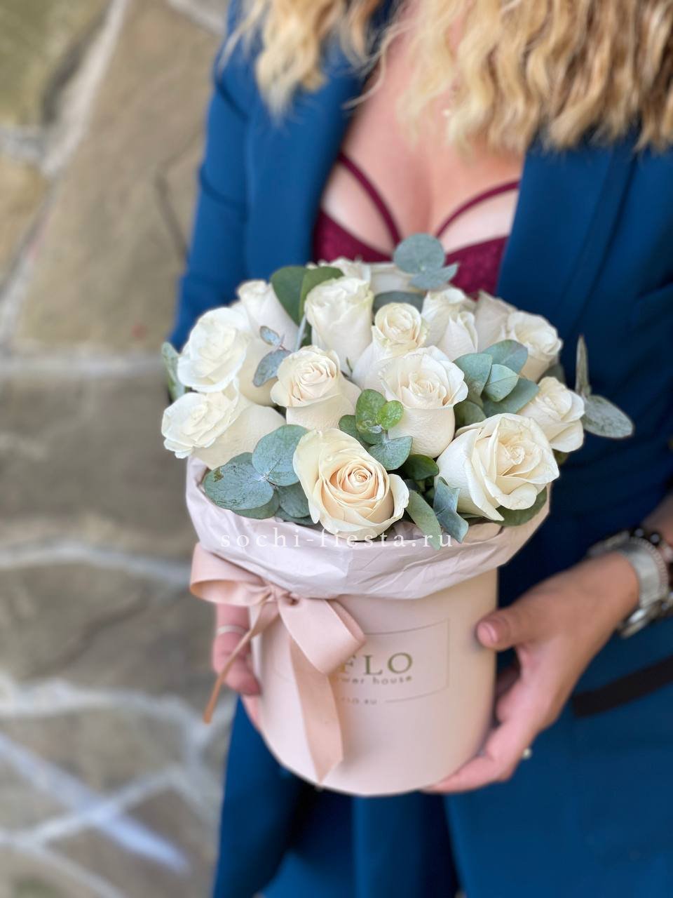 белые французские розы, эустома, гортензия, маттиола,  цилиндр D16.