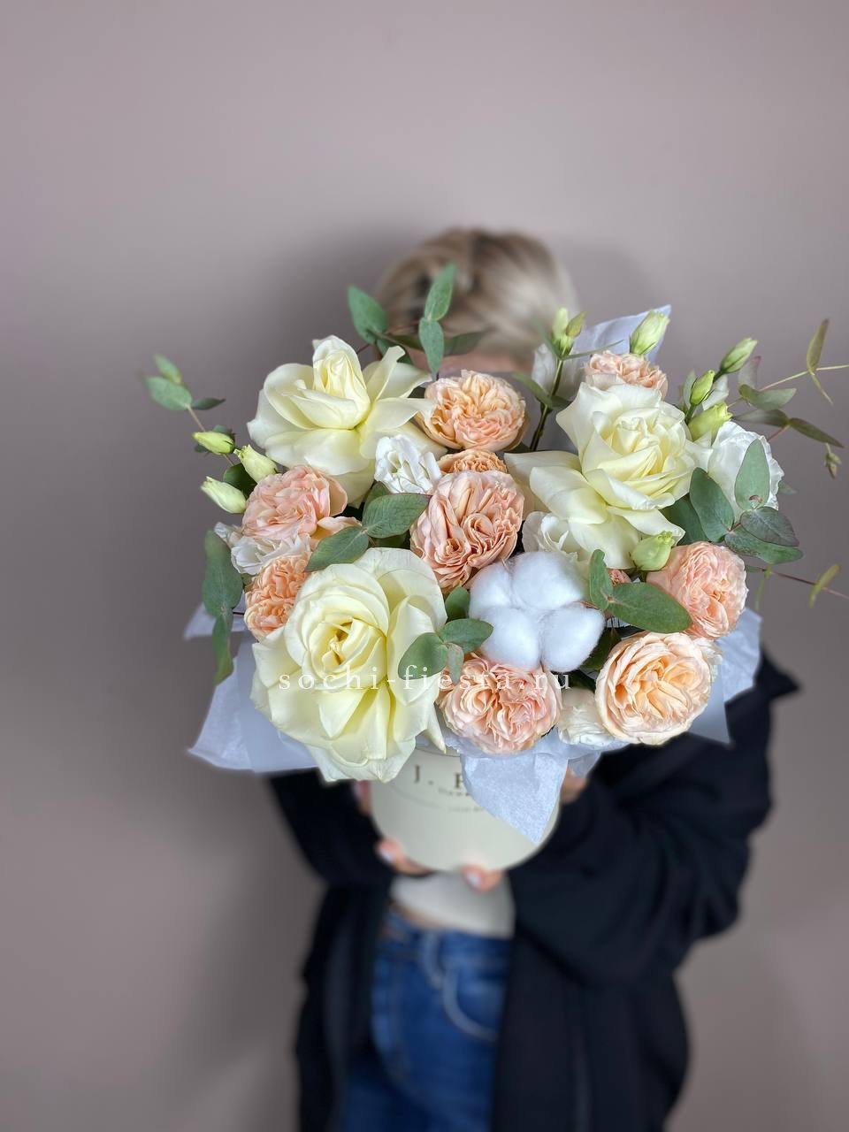 Воздушная композиция в пастельной гамме с акцентом на фактуру раскрытых бутонов. Пионовидные розы и эустома создают объёмный силуэт, а хлопок добавляет графичности.