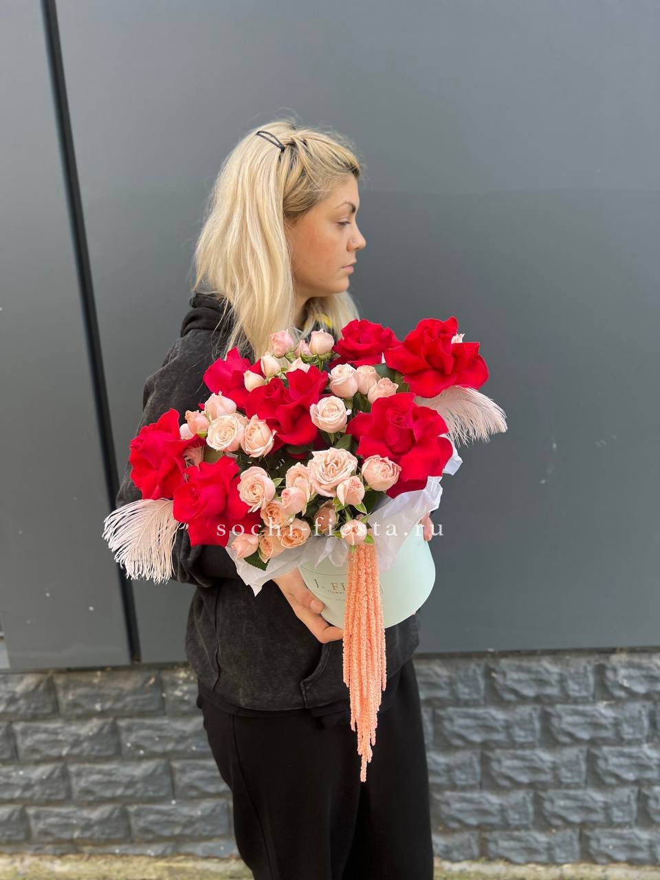 Красные французские розы с плотными бутонами дополнены воздушным бомбастиком и лёгкими перьями. Композиция выглядит собранно и сдержанно.