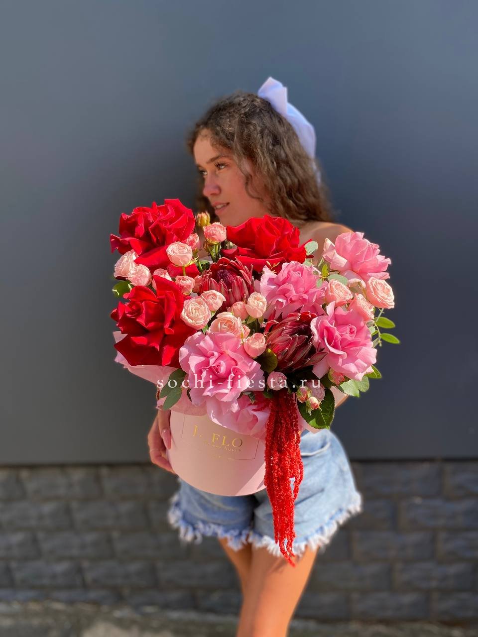 Букет выполнен в насыщенной красно-розовой гамме, создавая контрастное и выразительное сочетание, которое может символизировать сильные чувства или страсть. Это современный авторский букет, который выглядит роскошно и эффектно, подходящий для особых случаев и подарков.