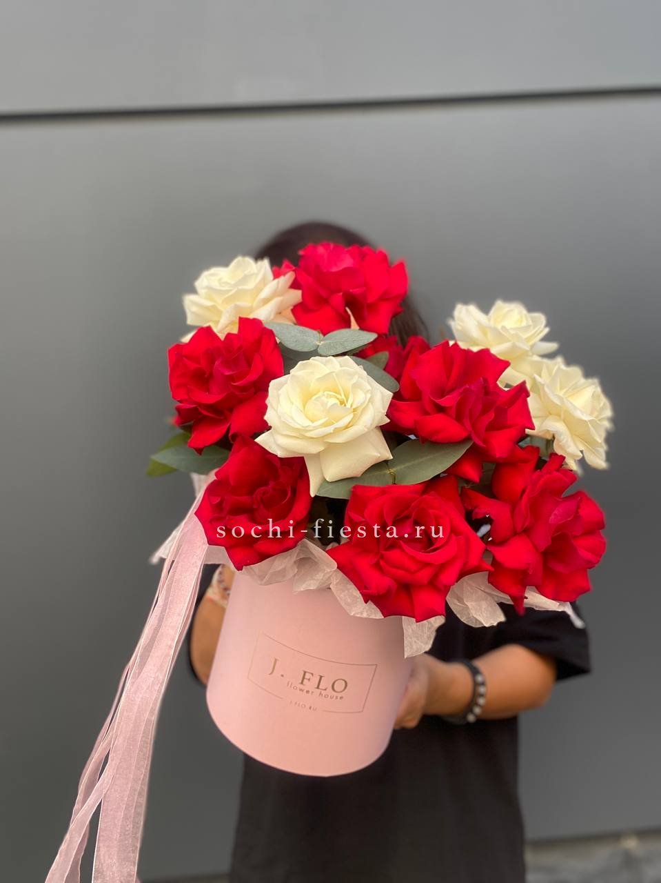 Тринадцать французских роз в двух цветах уложены так, что белый и красный чередуются ровными рядами. Компактный цилиндр фиксирует букет и позволяет разместить его на узкой поверхности.
