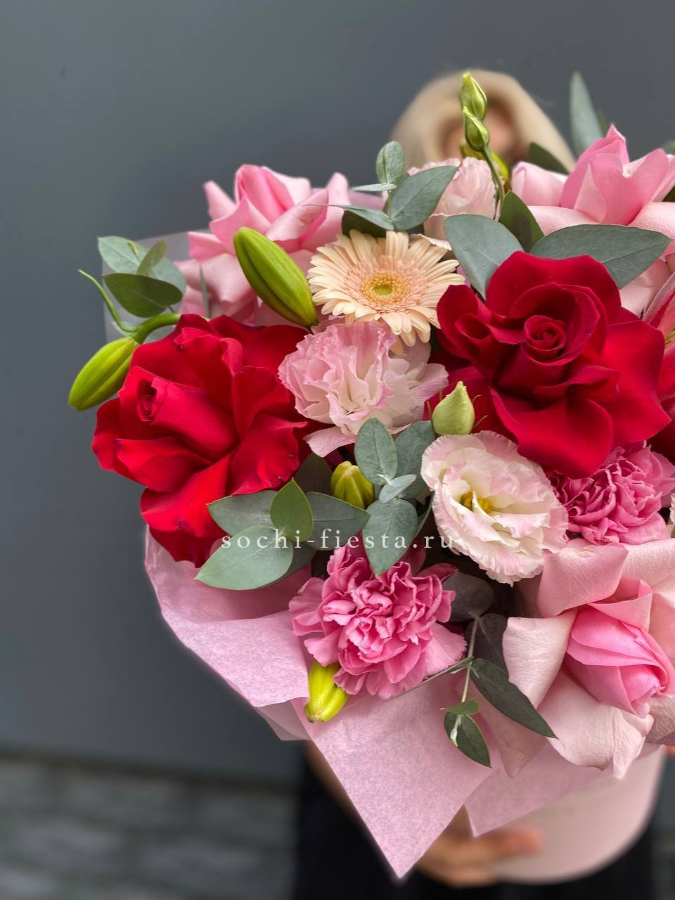 розы, протея, диантус, гербера, эустома, лилия, бокс 20.