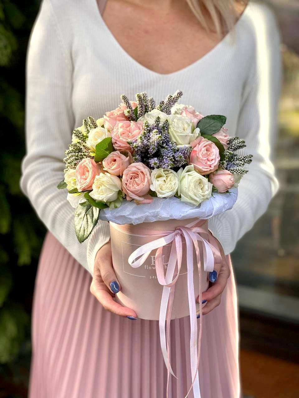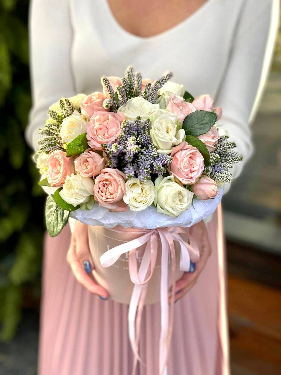 роза, диантус, пионы или гортензия, розы, бомбастик, эустома, декоративная зелень, цилиндр D16.