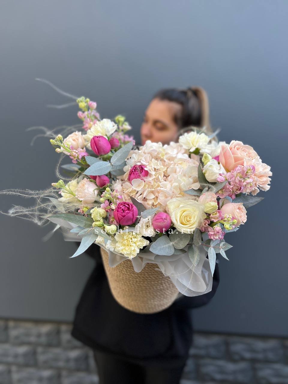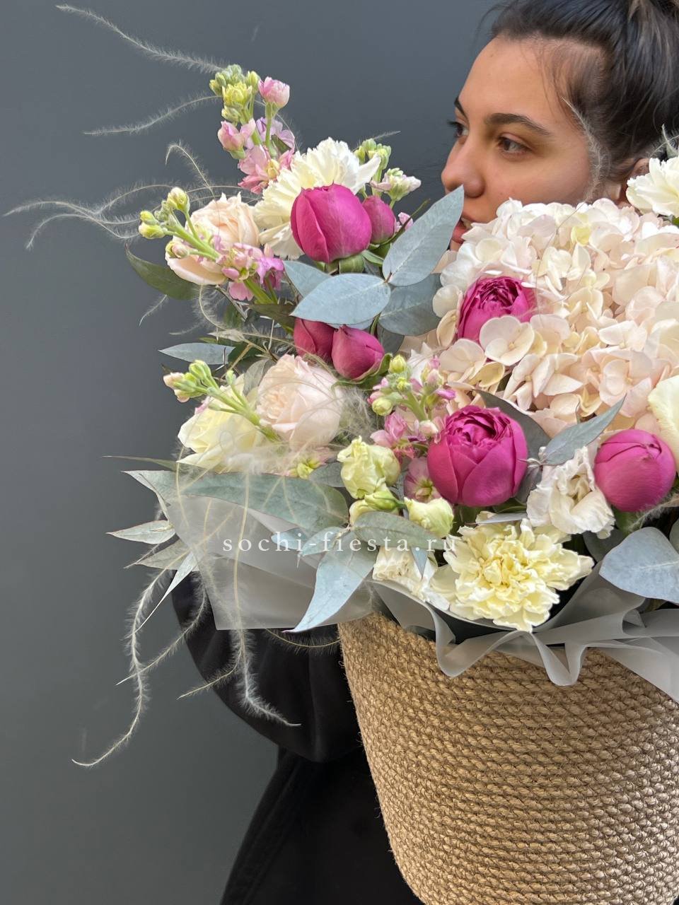 пионовидные розы Мисти Бабблс, гортензия, розы, диантусы, эустома, маттиола, джутовое кашпо, стифа, эвкалипт.