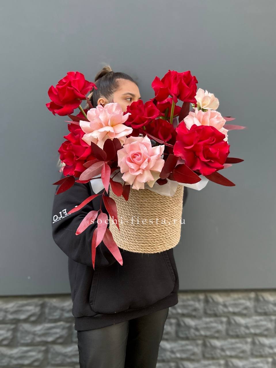 розы и гацинты в джутовом кашпо.