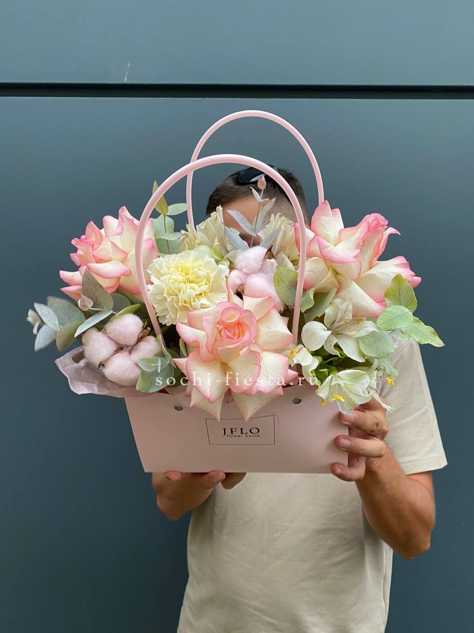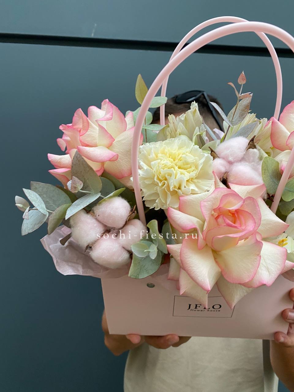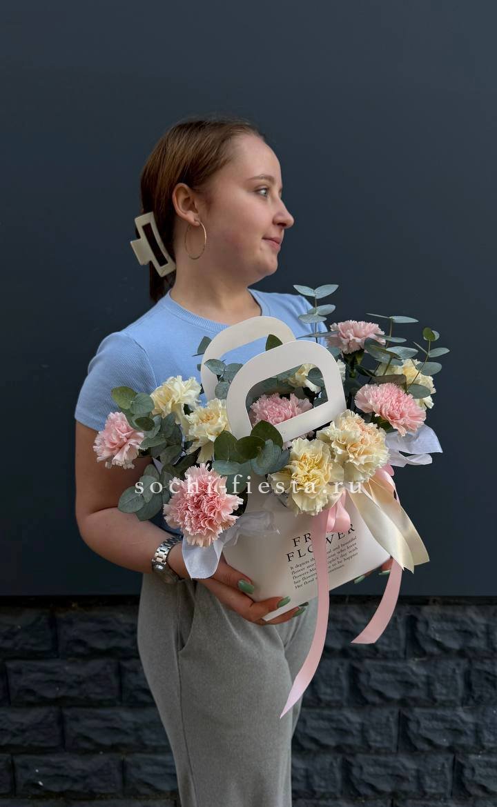 гортензия, джумилия, гербера, сумочка.