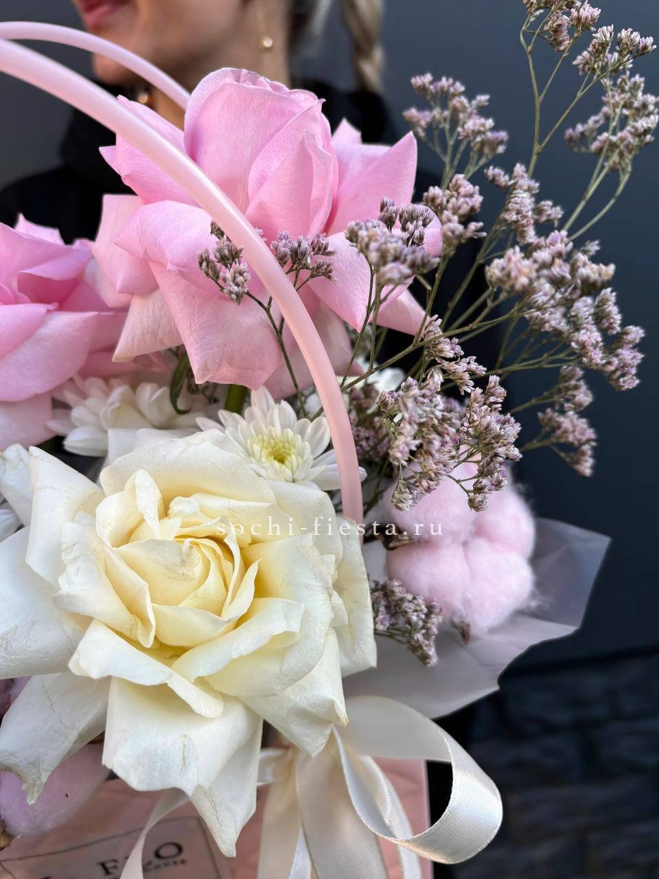 Голубая гортензия задаёт тон всей композиции, где хризантема и эустома создают объём, а хлопок с лагурусом добавляют воздушности. Сумочка вмещает насыщенную палитру без перегруженности.