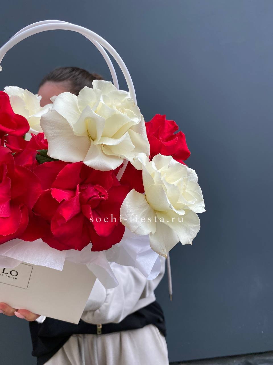 Французские розы двух оттенков собраны плотной шапкой в компактной сумочке. Белый и красный создают чёткий визуальный ритм без лишних деталей. Формат удобен для подарка или украшения пространства.