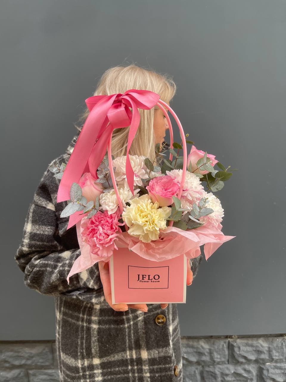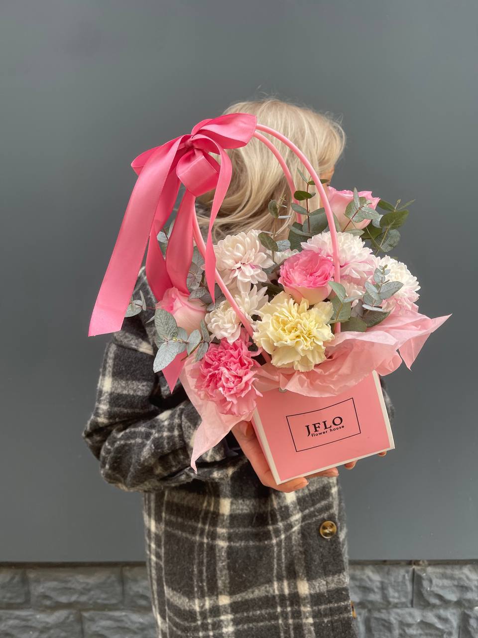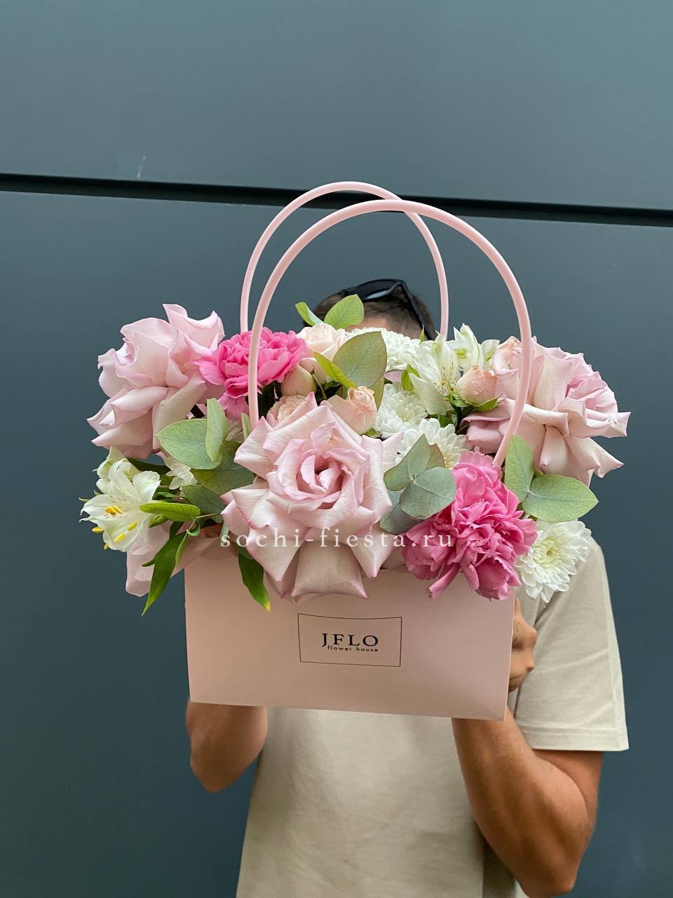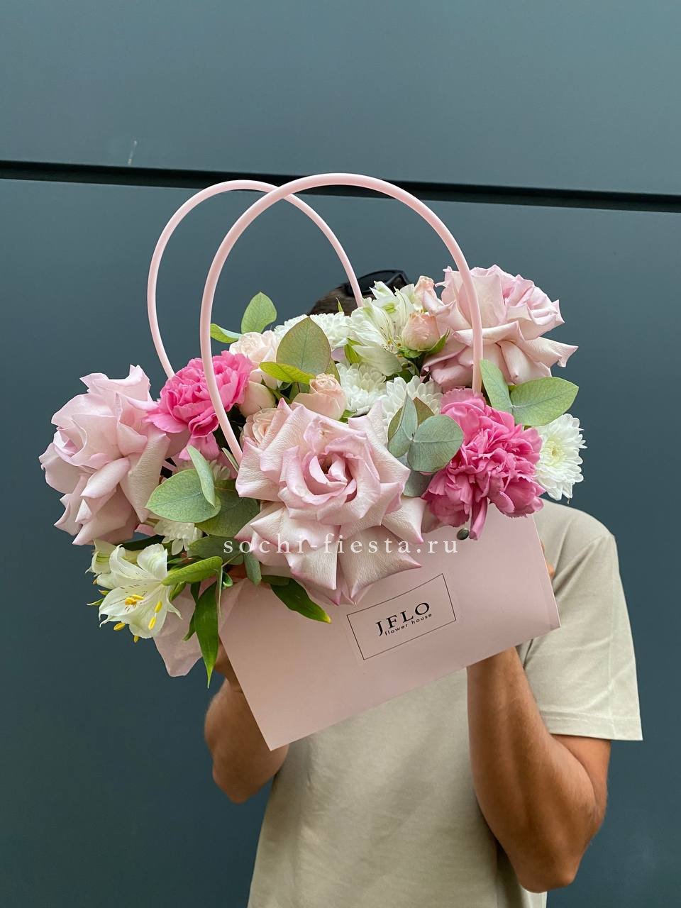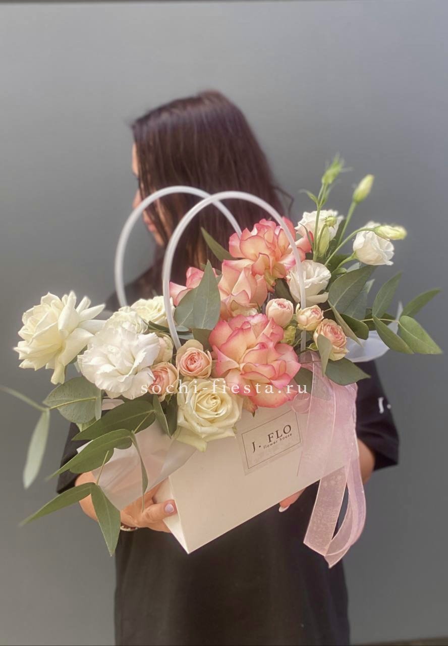 Розовые розы и диантусы переплетаются с кустовыми хризантемами в плотной округлой композиции. Альстромерия добавляет графичные акценты между бутонами. Сумочка собирает все элементы в аккуратную форму с естественным объёмом.