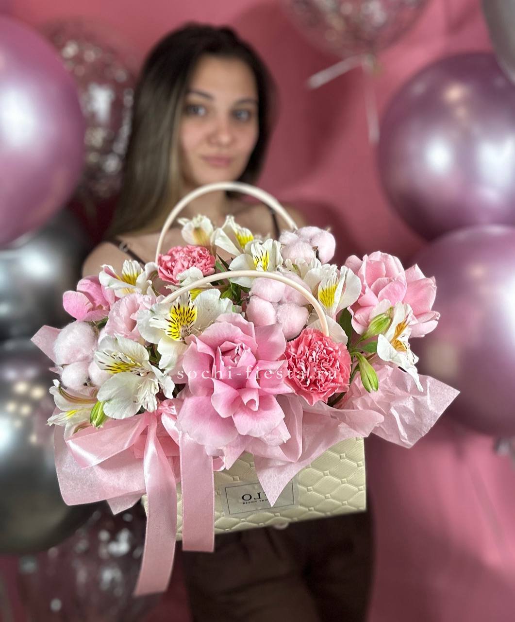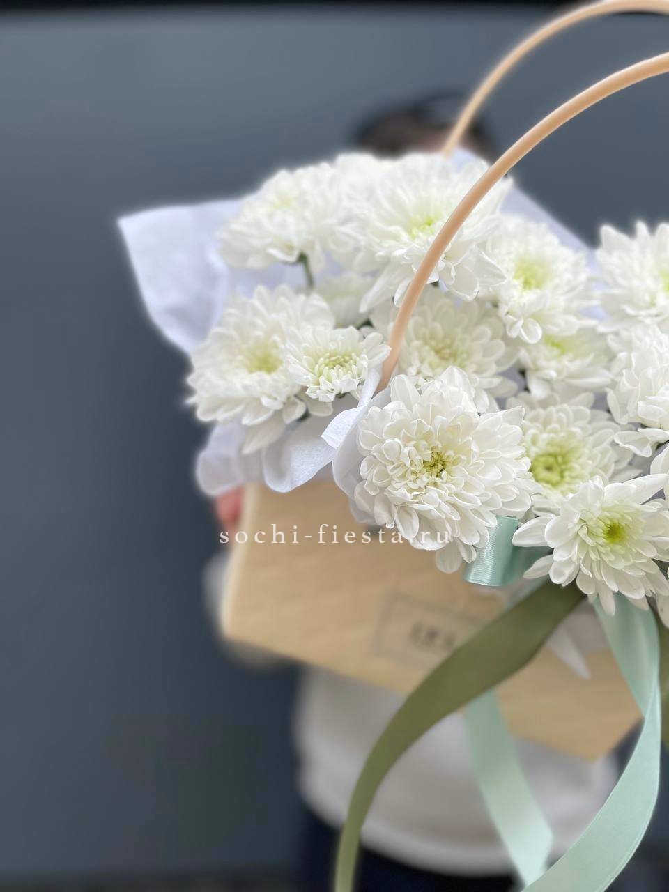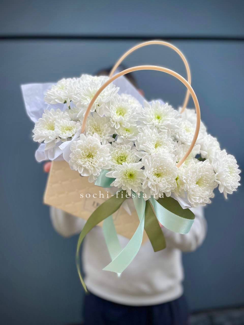 Хризантемы и маттиола собраны в компактную форму с лиловыми переливами. Статица добавляет воздушности, а сумочка делает композицию мобильной и готовой к вручению. Цветы закреплены в оазисе для длительной свежести.